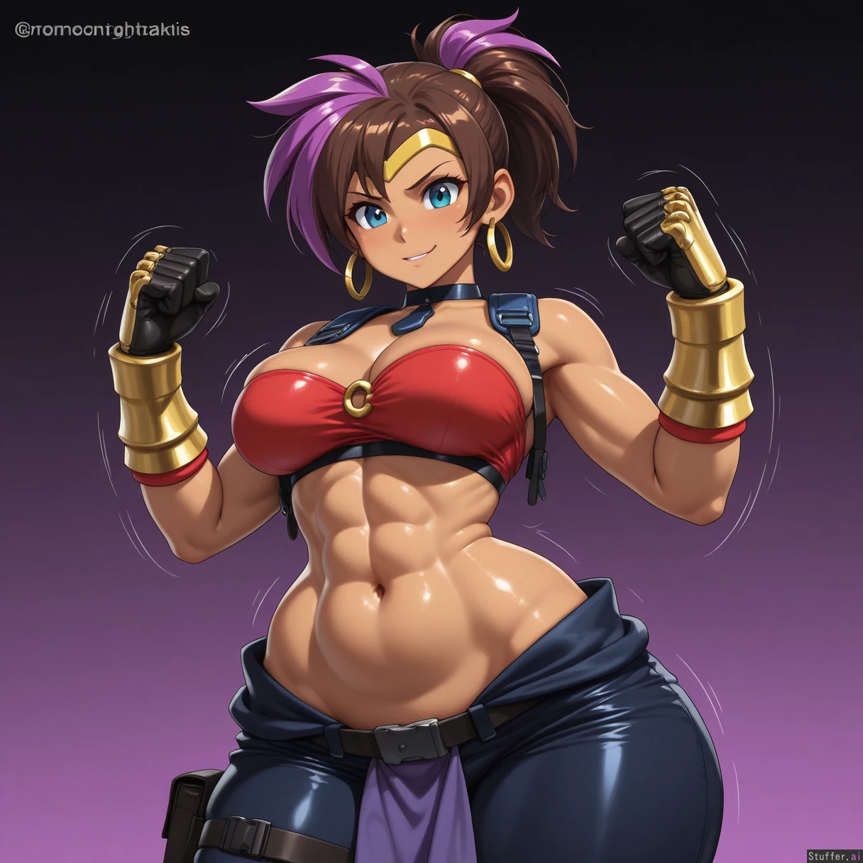 ((((solo)))), (((very accurate fused Jill Valentine Shantae amalgamation with perfect blend of both Shantae and Jill Valentine physical characteristics))), confident, tomboy appearance, (small ponytail), ((fair brown skin)), (((fusion))), large breasts, (((very long brown and purple highlighted hair))), (tall), ((elongated body)), (small blue eyes), large breasts, ((((highly detailed deep navel)))), (((highly detailed soft stomach))), (((wide hips))), (((wide waist))), (((wearing tactical blue harem outfit))), ((wearing red tube top)), (motion lines), smooth details, (nightime background), high quality art, golden glove cuffs, black gloves, thick thighs, ((lower abdomen fat)), ((highly detailed rough abs)), realistic proportions, (((resident evil artstyle))), ((hoop earrings)), dark background, ((ready to fight pose))