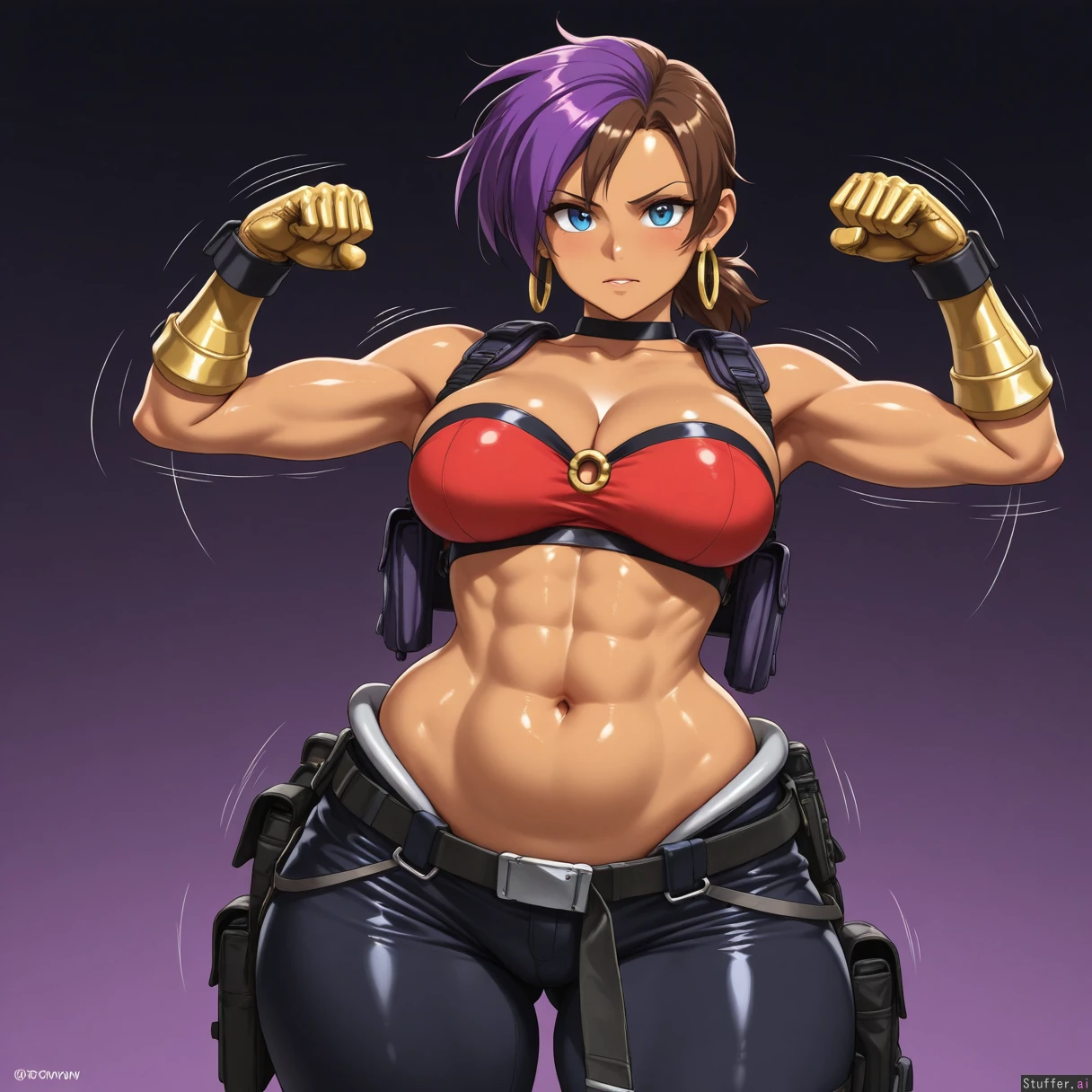 ((((solo)))), (((very accurate fused Jill Valentine Shantae amalgamation with perfect blend of both Shantae and Jill Valentine physical characteristics))), confident, (tomboy appearance), (small ponytail), ((fair brown skin)), (((fusion))), large breasts, (((very long brown and purple highlighted hair))), (tall), ((elongated body)), (small blue eyes), large breasts, ((((highly detailed deep navel)))), (((highly detailed soft stomach))), (((very wide hips))), (((very wide waist))), (((wearing tactical blue harem outfit))), ((wearing red tube top)), (motion lines), smooth details, (nightime background), high quality art, golden glove cuffs, black gloves, thick thighs, ((lower abdomen fat)), ((highly detailed rough abs)), realistic proportions, (((resident evil artstyle))), ((hoop earrings)), dark background, ((ready to fight pose))