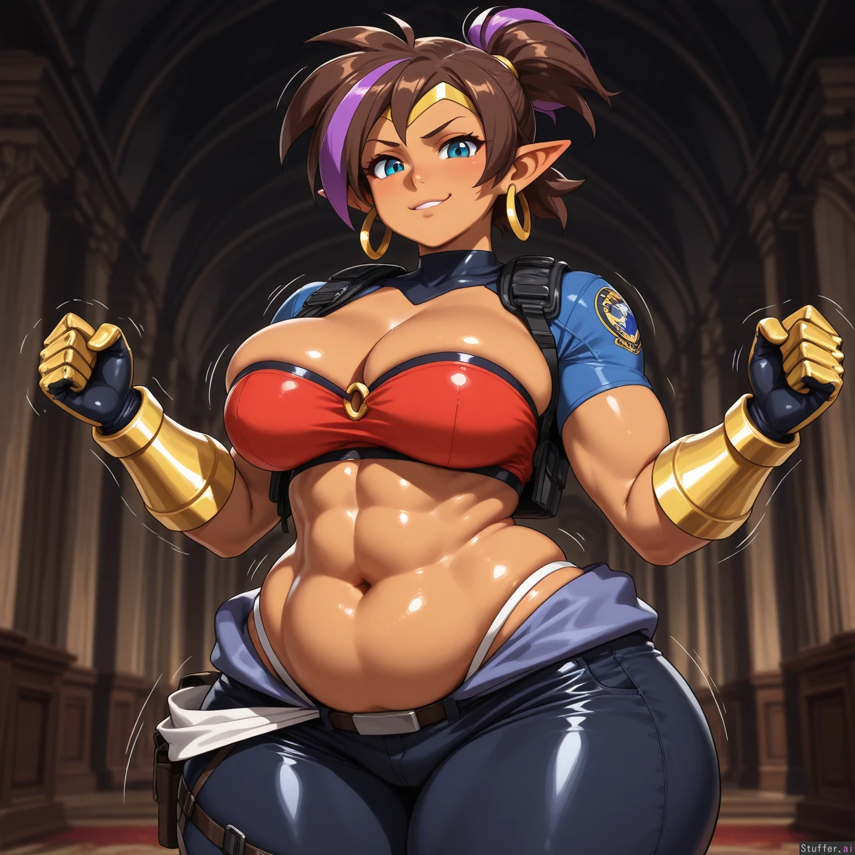 ((((solo)))), (((very accurate fused Jill Valentine Shantae amalgamation with perfect blend of both Shantae and Jill Valentine physical characteristics))), confident, slightly smug, (tomboy appearance), (small ponytail), ((fair brown skin)), (((fusion))), large breasts, (((very long brown and purple highlighted hair))), (tall), ((elongated body)), (small blue eyes), large breasts, ((((highly detailed deep navel)))), (((highly detailed soft stomach))), (((very wide hips))), (((very wide waist))), (((wearing tactical blue harem outfit))), ((wearing red tube top)), (motion lines), smooth details, (nightime mansion background), high quality art, golden glove cuffs, black gloves, thick thighs, ((lower abdomen fat)), ((highly detailed rough abs)), realistic proportions, (((resident evil artstyle))), ((hoop earrings)), dark background, ((ready to fight pose))