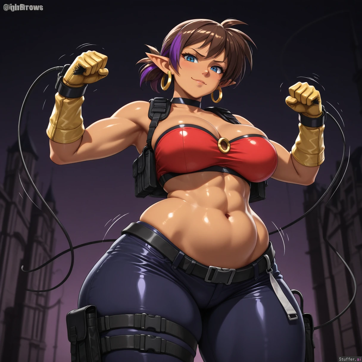 ((((solo)))), (((very accurate fused Jill Valentine Shantae amalgamation with perfect blend of both Shantae and Jill Valentine physical characteristics))), slightly smug, (tomboy appearance), (small ponytail), ((fair brown skin)), (((fusion))), large breasts, (((very long brown and purple highlighted hair))), (tall), ((elongated body)), (small blue eyes), large breasts, ((((highly detailed deep navel)))), (((highly detailed soft stomach))), (((very wide hips))), (((very wide waist))), (((wearing tactical blue harem outfit))), ((wearing red tube top)), (motion lines), smooth details, (nightime mansion background), high quality art, golden glove cuffs, black gloves, thick thighs, ((lower abdomen fat)), ((highly detailed rough abs)), realistic proportions, (((resident evil artstyle))), ((hoop earrings)), dark background, ((ready to fight pose))
