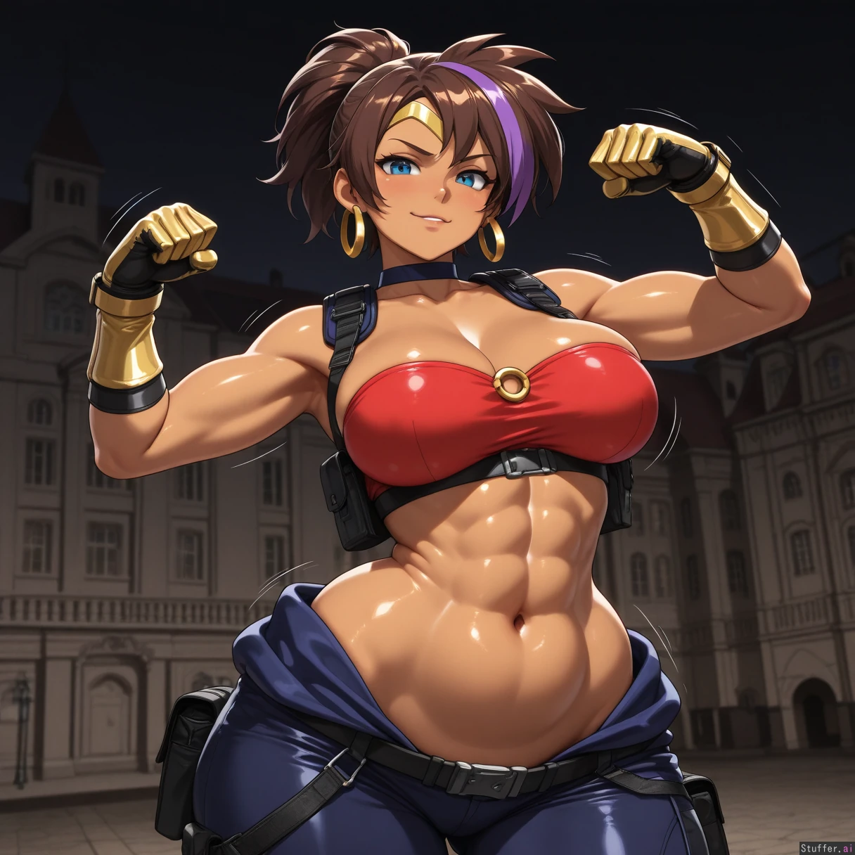 ((((solo)))), (((very accurate fused Jill Valentine Shantae amalgamation with perfect blend of both Shantae and Jill Valentine physical characteristics))), slightly smug, (tomboy appearance), (small ponytail), ((fair brown skin)), (((fusion))), large breasts, (((very long brown and purple highlighted hair))), (tall), ((elongated body)), (small blue eyes), large breasts, ((((highly detailed deep navel)))), (((highly detailed soft stomach))), (((very wide hips))), (((very wide waist))), (((wearing tactical blue harem outfit))), ((wearing red tube top)), (motion lines), smooth details, (nightime mansion background), high quality art, golden glove cuffs, black gloves, thick thighs, ((lower abdomen fat)), ((highly detailed rough abs)), realistic proportions, (((resident evil artstyle))), ((hoop earrings)), dark background, ((ready to fight pose))