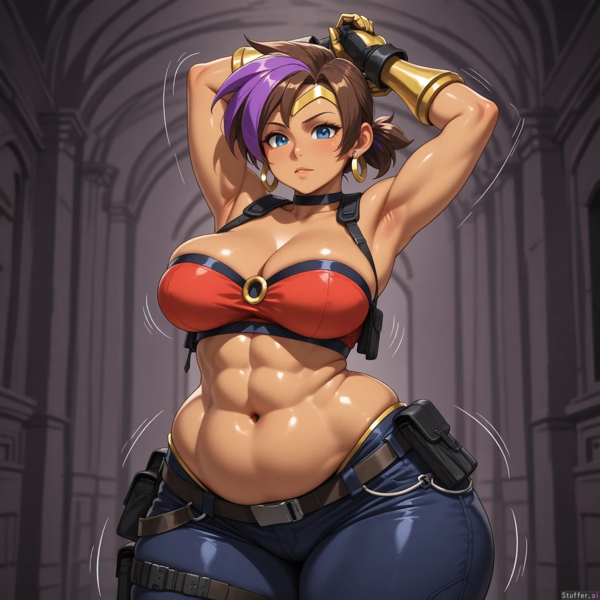 ((((solo)))), (((very accurate fused Jill Valentine Shantae amalgamation with perfect blend of both Shantae and Jill Valentine physical characteristics))), (tomboy appearance), (small ponytail), ((fair brown skin)), (((fusion))), large breasts, (((very long brown and purple highlighted hair))), (tall), ((elongated body)), (small blue eyes), large breasts, ((((highly detailed deep navel)))), (((highly detailed soft stomach))), (((very wide hips))), (((very wide waist))), (((wearing tactical blue harem outfit))), ((wearing red tube top)), (motion lines), smooth details, (nightime mansion background), high quality art, golden glove cuffs, black gloves, thick thighs, ((lower abdomen fat)), ((highly detailed rough abs)), realistic proportions, (((resident evil artstyle))), ((hoop earrings)), dark background, ((stretching)), arms above head, (((flaunting midriff)))