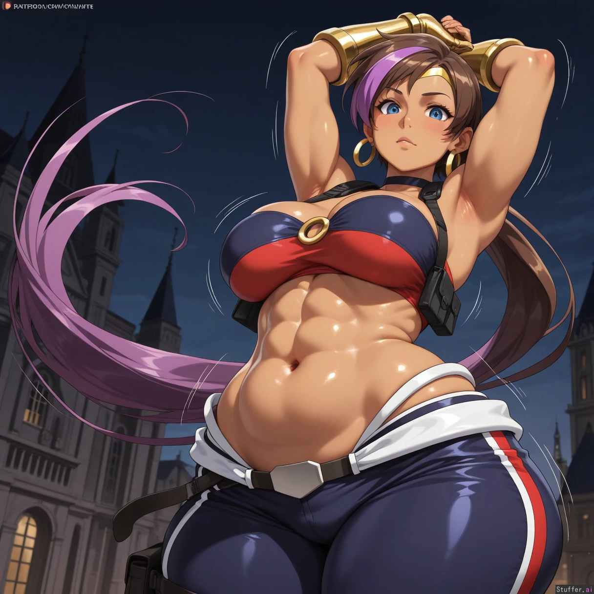 ((((solo)))), (((very accurate fused Jill Valentine Shantae amalgamation with perfect blend of both Shantae and Jill Valentine physical characteristics))), (tomboy appearance), (small ponytail), ((fair brown skin)), (((fusion))), large breasts, (((very long brown and purple highlighted hair))), (tall), ((elongated body)), (small blue eyes), large breasts, ((((highly detailed deep navel)))), (((highly detailed soft stomach))), (((very wide hips))), (((very wide waist))), (((wearing tactical blue harem outfit))), ((wearing red tube top)), (motion lines), smooth details, (nightime mansion background), high quality art, golden glove cuffs, black gloves, thick thighs, ((lower abdomen fat)), ((highly detailed rough abs)), realistic proportions, (((resident evil artstyle))), ((hoop earrings)), dark background, ((stretching)), arms above head, (((flaunting her midriff)))