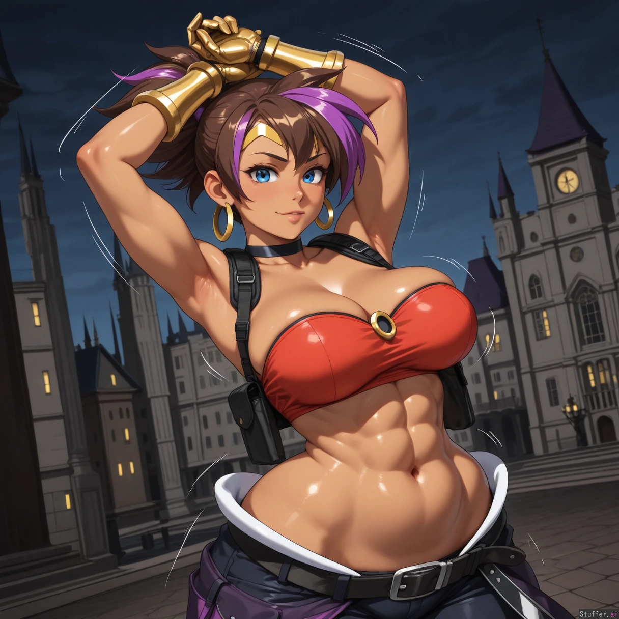 ((((solo)))), (((very accurate fused Jill Valentine Shantae amalgamation with perfect blend of both Shantae and Jill Valentine physical characteristics))), (tomboy appearance), (small ponytail), ((fair brown skin)), (((fusion))), large breasts, (((very long brown and purple highlighted hair))), (tall), ((elongated body)), (small blue eyes), large breasts, ((((highly detailed deep navel)))), (((highly detailed soft stomach))), (((very wide hips))), (((very wide waist))), (((wearing tactical blue harem outfit))), ((wearing red tube top)), (motion lines), smooth details, (nightime mansion background), high quality art, golden glove cuffs, black gloves, thick thighs, ((lower abdomen fat)), ((highly detailed rough abs)), realistic proportions, (((resident evil artstyle))), ((hoop earrings)), dark background, ((stretching)), arms above head, (((flaunting her midriff proudly)))