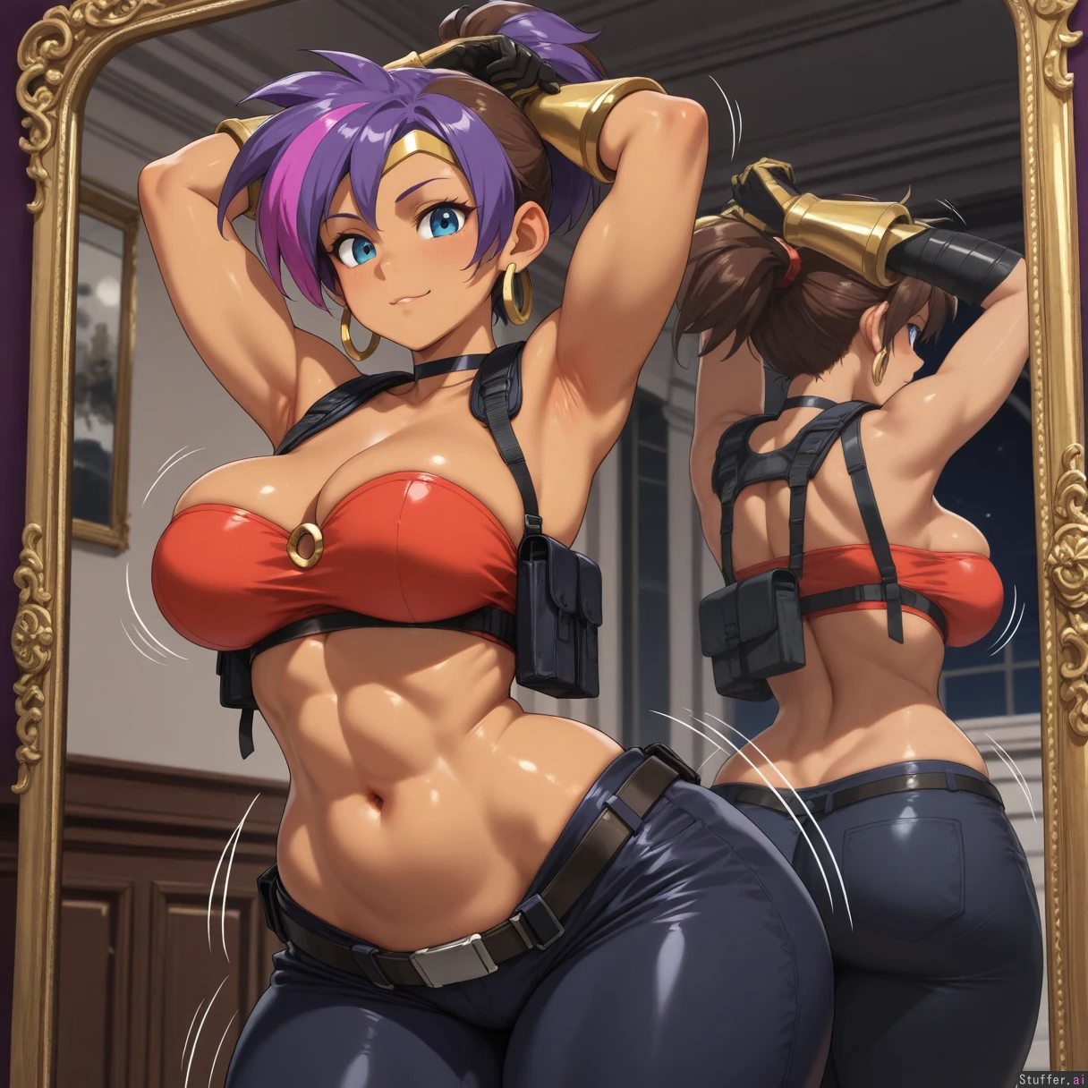 ((((solo)))), (((very accurate fused Jill Valentine Shantae amalgamation with perfect blend of both Shantae and Jill Valentine physical characteristics))), (tomboy appearance), (small ponytail), ((fair brown skin)), (((fusion))), large breasts, (((very long brown and purple highlighted hair))), (tall), ((elongated body)), (small blue eyes), large breasts, ((((highly detailed deep navel)))), (((highly detailed soft stomach))), (((very wide hips))), (((very wide waist))), (((wearing tactical blue harem outfit))), ((wearing red tube top)), (motion lines), smooth details, (nightime mansion background), high quality art, golden glove cuffs, black gloves, thick thighs, ((lower abdomen fat)), ((highly detailed rough abs)), realistic proportions, (((resident evil artstyle))), ((hoop earrings)), dark background, ((stretching)), arms above head, (((flaunting her midriff proudly in front of mirror))), ((hip shake))