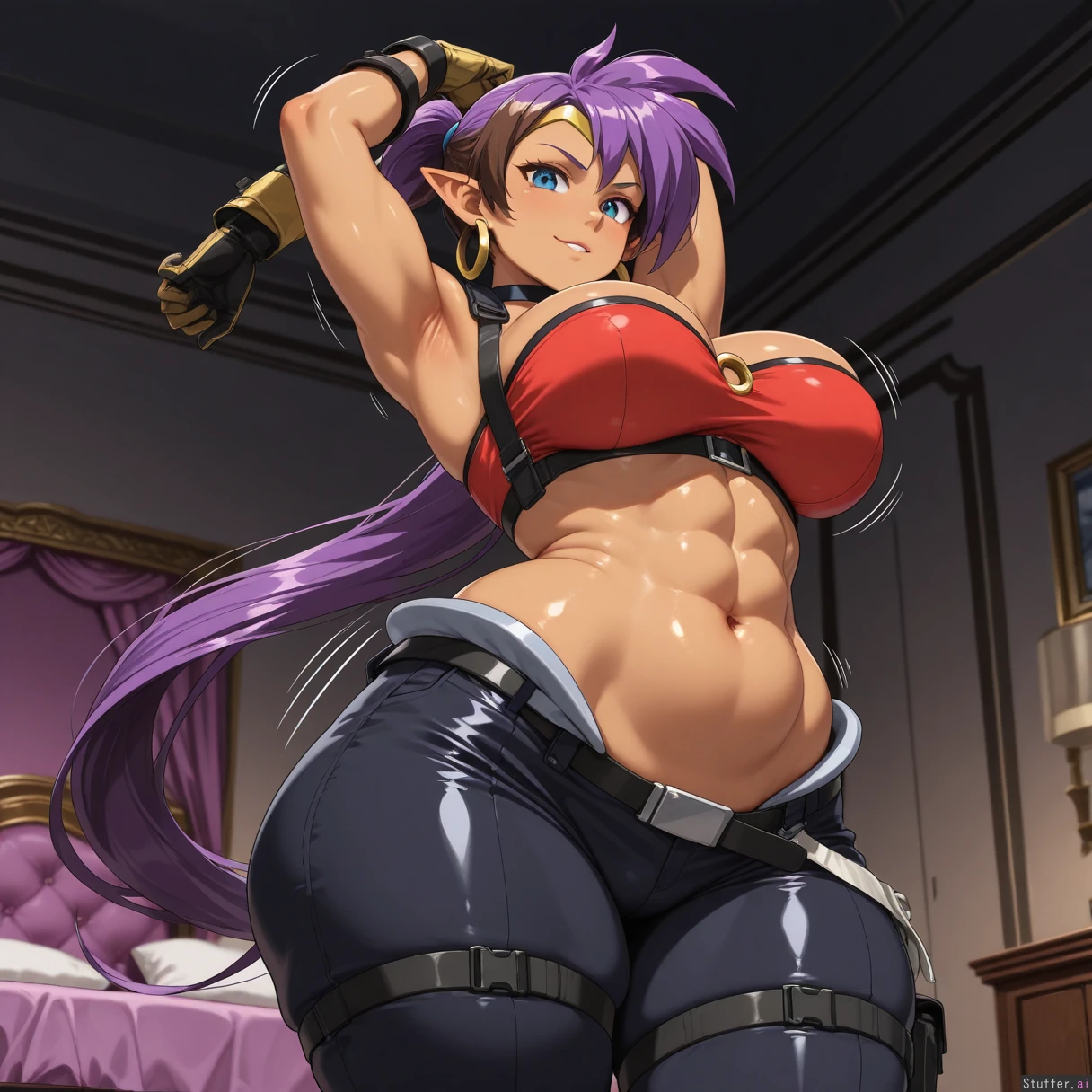 ((((solo)))), (((very accurate fused Jill Valentine Shantae amalgamation with perfect blend of both Shantae and Jill Valentine physical characteristics))), (tomboy appearance), (small ponytail), ((fair brown skin)), (((fusion))), large breasts, (((very long brown and purple highlighted hair))), (tall), ((elongated body)), (small blue eyes), large breasts, ((((highly detailed deep navel)))), (((highly detailed soft stomach))), (((very wide hips))), (((very wide waist))), (((wearing tactical blue harem outfit))), ((wearing red tube top)), (motion lines), smooth details, (nightime mansion room background), high quality art, golden glove cuffs, black gloves, thick thighs, ((lower abdomen fat)), ((highly detailed rough abs)), realistic proportions, (((resident evil artstyle))), ((hoop earrings)), dark background, ((stretching)), arms above head, (((flaunting her midriff proudly))), ((hip shake))