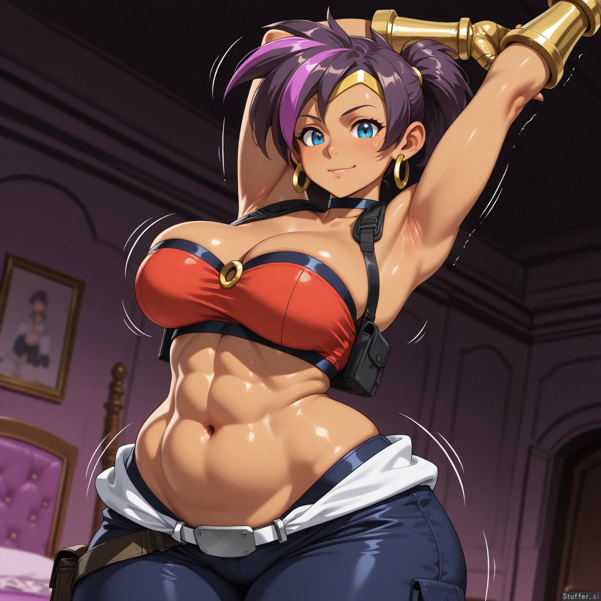((((solo)))), (((very accurate fused Jill Valentine Shantae amalgamation with perfect blend of both Shantae and Jill Valentine physical characteristics))), (tomboy appearance), (small ponytail), ((fair brown skin)), (((fusion))), large breasts, (((very long brown and purple highlighted hair))), (tall), ((elongated body)), (small blue eyes), large breasts, ((((highly detailed deep navel)))), (((highly detailed soft stomach))), (((very wide hips))), (((very wide waist))), (((wearing tactical blue harem outfit))), ((wearing red tube top)), (motion lines), smooth details, (nightime mansion room background), high quality art, golden glove cuffs, black gloves, thick thighs, ((lower abdomen fat)), ((highly detailed rough abs)), realistic proportions, (((resident evil artstyle))), ((hoop earrings)), dark background, ((stretching)), arms above head, (((showing off her midriff proudly))), ((hip shake))