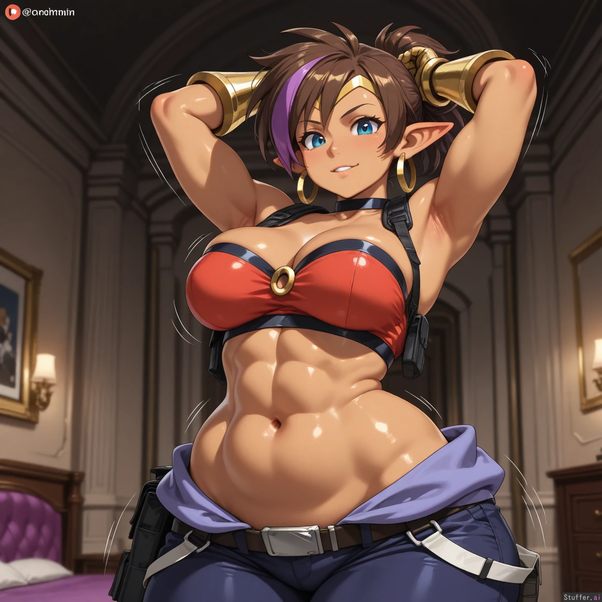 ((((solo)))), (((very accurate fused Jill Valentine Shantae amalgamation with perfect blend of both Shantae and Jill Valentine physical characteristics))), (tomboy appearance), (small ponytail), ((fair brown skin)), (((fusion))), large breasts, (((very long brown and purple highlighted hair))), (tall), ((elongated body)), (small blue eyes), large breasts, ((((highly detailed deep navel)))), (((highly detailed soft stomach))), (((very wide hips))), (((very wide waist))), (((wearing tactical blue harem outfit))), ((wearing red tube top)), (motion lines), smooth details, (nightime mansion room background), high quality art, golden glove cuffs, black gloves, thick thighs, ((lower abdomen fat)), ((highly detailed rough abs)), realistic proportions, (((resident evil artstyle))), ((hoop earrings)), dark background, ((stretching)), arms above head, (((showing off her midriff proudly))), ((hip shake))