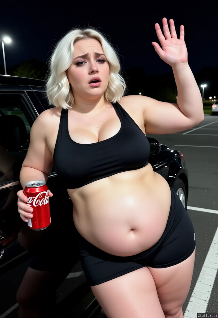 Bbw, Big bloated belly, Pale skin, platinum blonde, wavy bob, black sports bra, black gym shorts, tight clothes, thicc, bulky build, athletic, stocky, parking_lot, by_black_car, cleavage,(chubby_belly,) tight_bra, tight_clothing tight_clothes, slightly_chubby, wide_hips wide_thighs wide_ass huge_breasts, chubby, natural_lighting (plump, stuffed_belly, chubby_female chubby_belly , big_breasts big_thighs, abs), slim_chin, , sick, sick to stomach, tired, exhausted, (((very_full, stuffed_belly, super_bloated, fat))) queasy, night, ((( exit_doors, obese_belly, very_full, full_belly, stuffed_belly,, eyeliner, eyeshadow, lipstick,groaning,looking_at_viewer, holding_coke_can, good_lighting, detailed_face, high_res, bbw, fat_female, huge_belly, hanging_belly, hanging_breasts, obese, coke can))) dramatic_lighting, big_breasts, tired, exhausted, leaning_hand_against_car, catching_breath, waving_goodbye, eyes_on_viewer