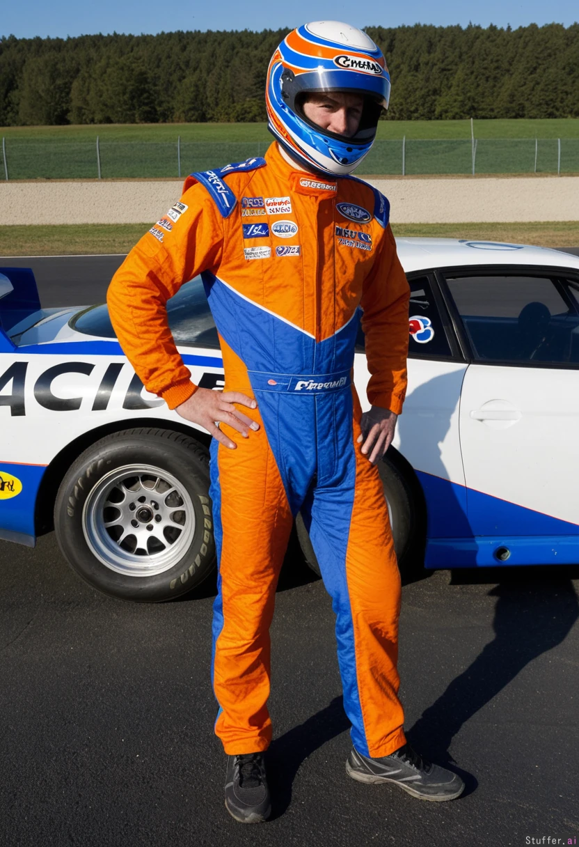 male racecar driver in an orange and blue suit, standing in front of a racecar on a track, erection, mature_male, bottomless