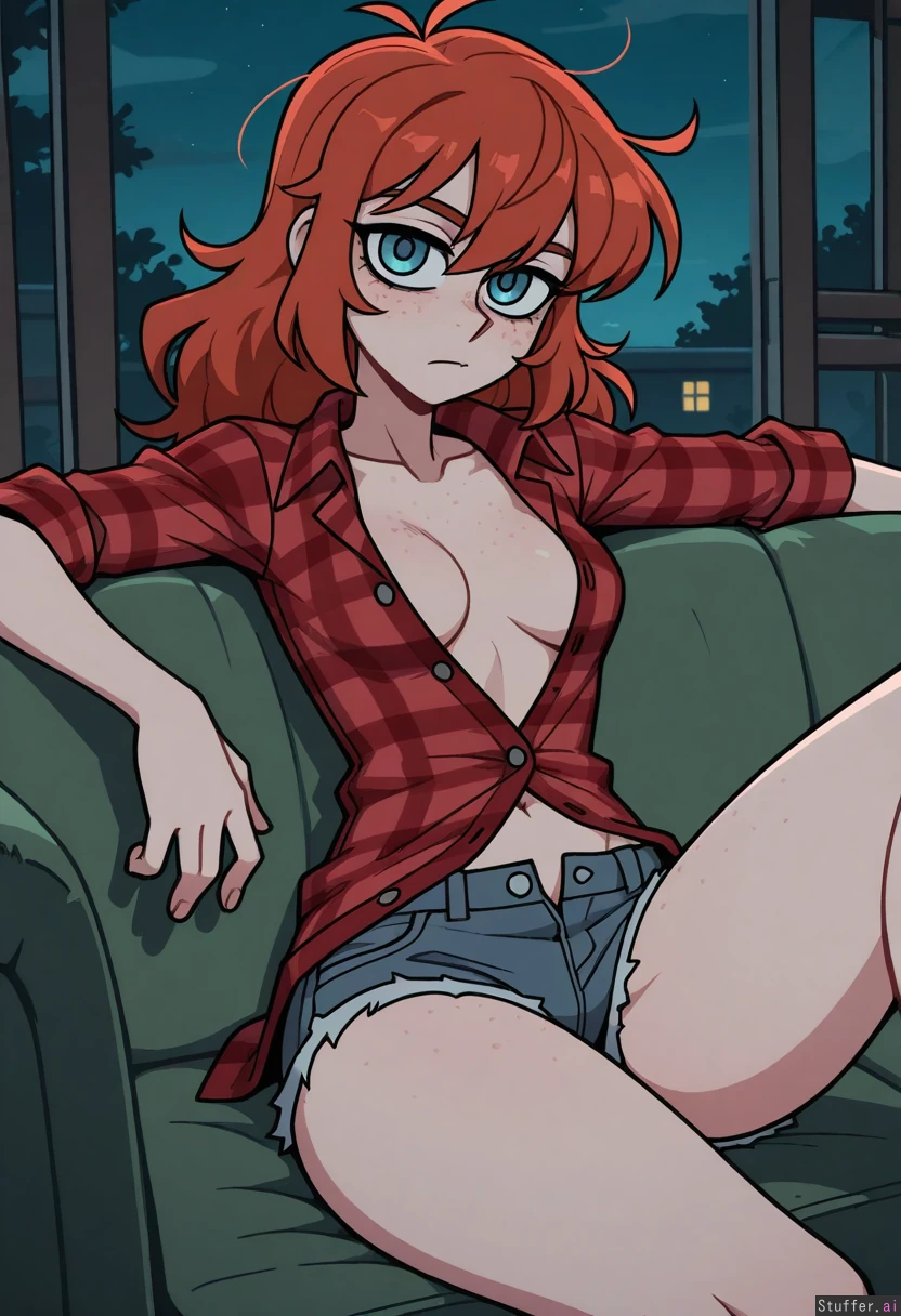 vanripper (artist), masterpiece, hyper resolution, beautiful face, best quality, high rating, (solo), 1female (Long maple hair, messy hair), (blue eyes), freckles, (looking at viewer), night time, sitting on couch, (Unbuttoned flannel, green), (torn unbuttoned jean shorts), (average hips), nerdy, freckles, freckled thighs, medium tits, canadian, skinny, skinny thighs