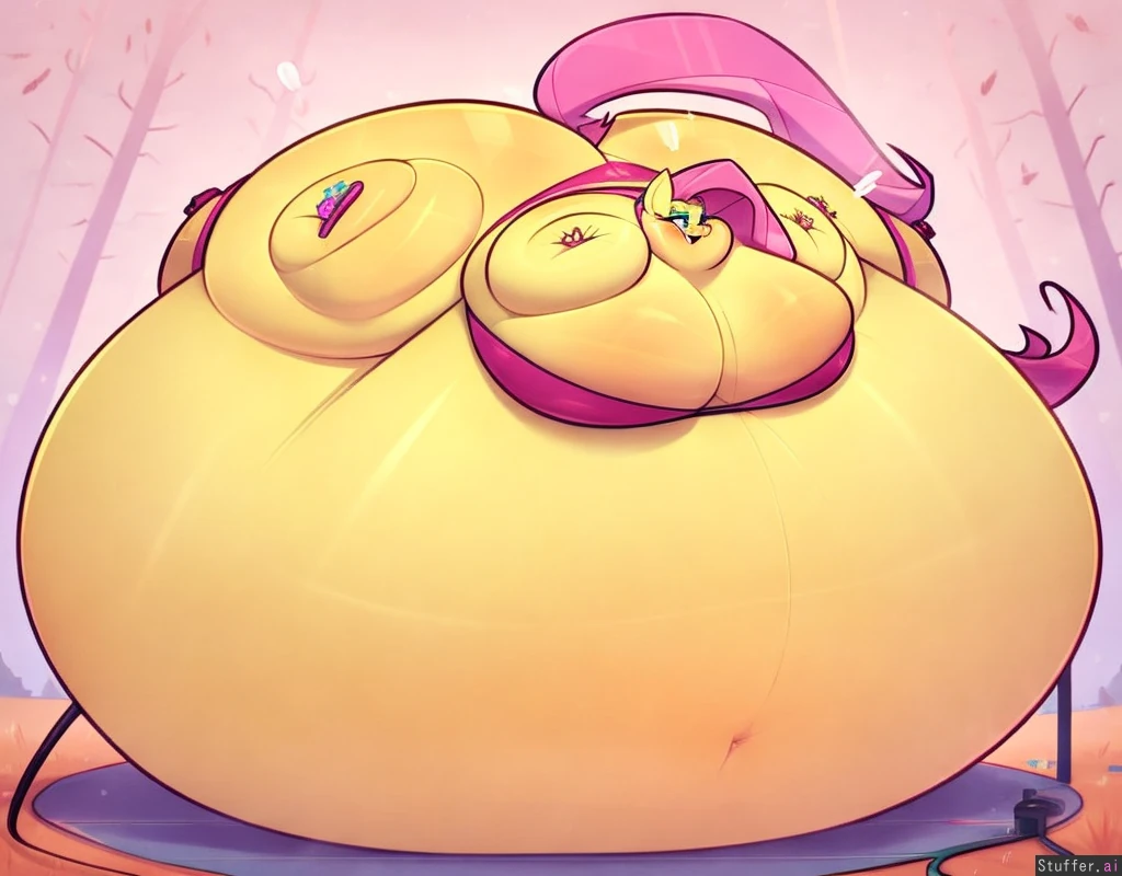 best quality, high rating, Cute, 8K, HD, (((perfect Anatomy))), cute MLP snout, (Fluttershy(MLP), ridiculouscake (artist)), (female anthro pony), ((laying on her massive belly)), massive round inflated belly, smiling contently, hyper_inflation, spherical_inflation, obese blob, fat face, fat neck, immobile, resting on belly, pink hair, ((laying on her inflated belly)), (massive wide round inflated butt)), ((Full body inflation)), (round fat body), (vibrant cute colours), ((fat legs)), ((cute horse tail in her ass)), ((no clothes)), ((forest environment)), ((chubby snout)) air_inflation, hose_inflation hose_in_butt hose plugged plug_(sex_toy) plug blimp
