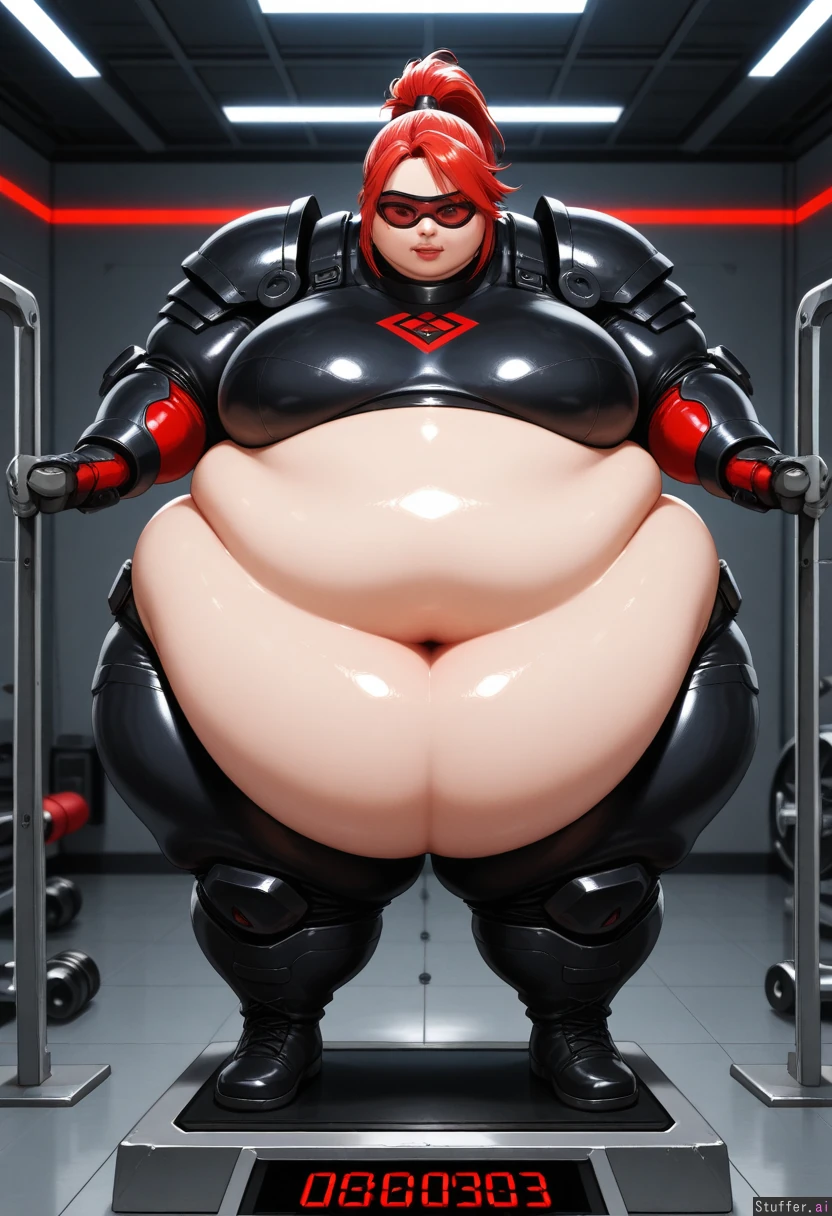 1woman, female, realistic A beautiful young woman with high ponytail with long red hair and sharp bangs, futuristic red polarized goggles. wide jaw, chubby face, red lips, rosy cheeks, makeup. She wears ultra-detailed futuristic cyber-samurai power armor in vibrant red and matte black with metallic gunmetal accents. The armor is form-fitting yet heavily plated: large angular black shoulder pauldrons, black metal chest plate, black-and-red arm armor, wearing utility belt. wearing tight thigh rig, reinforced black leg armor with black knee guards and heavy red plated boots. skintight black rubber bodysuit underneath armor. gruff, militant, villain, badass. gained weight, very fat, overweight. big heavy belly. soft fat rolls, fat arms, big soft fat thighs, large fat ass. curvy, feminine. (obese belly:2.3). (uncomfortable). (out of shape), (learning her weight, standing on weight scale), (foreign symbols on scale:1.5), full weight on scale. (looking down between boots:1.3), bending forward at waist, in disbelief, (shocked gasp), devastated, angry. soft round belly hangs. (both hands hold belly). futuristic hi-tech gym, room filled with fancy gym equipment, black motif with red lights, gym with weights and treadmills. facing viewer directly (single bellybutton:1.6)