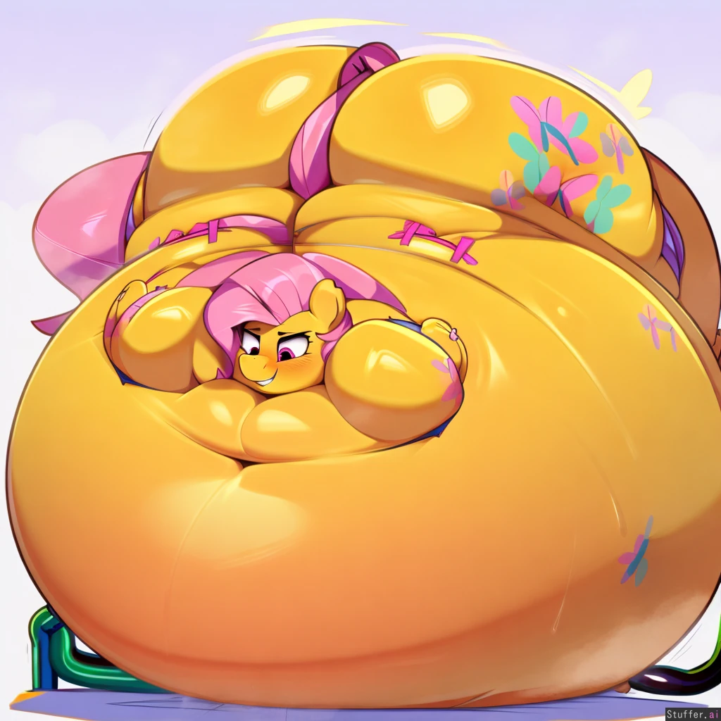 best quality, high rating, Cute, 8K, HD, perfect Anatomy, (((Fluttershy(MLP)))) ridiculouscake(artist), berseepon (artist), (female anthro pony), ((laying on massive belly)), smiling contently, hyper_inflation, spherical_inflation, air_inflation, hose_inflation hose_in_butt hose plugged