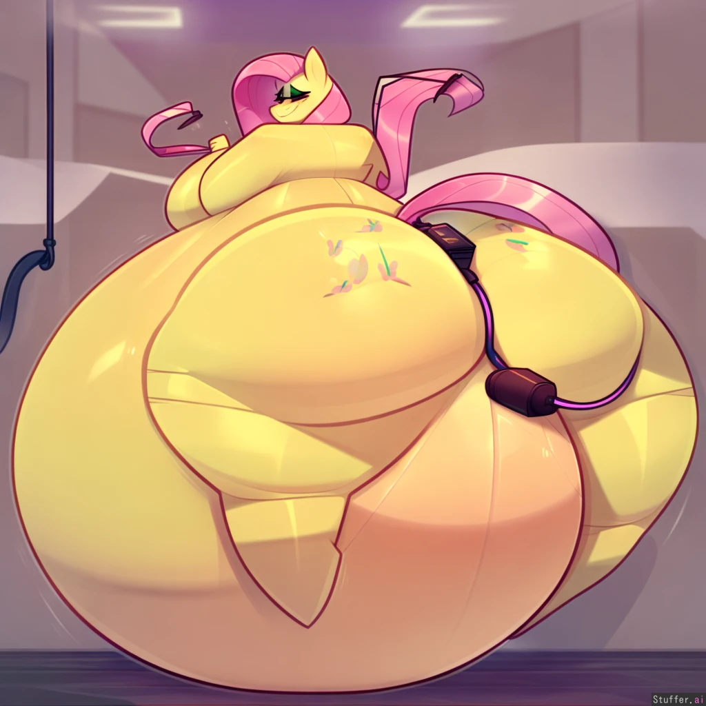 best quality, high rating, Cute, 8K, HD, (((perfect Anatomy))), cute MLP snout, (Fluttershy(MLP), ridiculouscake (artist)), (female anthro pony), ((laying on her massive belly)), massive round inflated belly, smiling contently, hyper_inflation, spherical_inflation, ((view from behind)) air_inflation, hose_inflation hose_in_butt hose plugged plug_(sex_toy) plug blimp, huge butt, thighs, sunken_limbs
