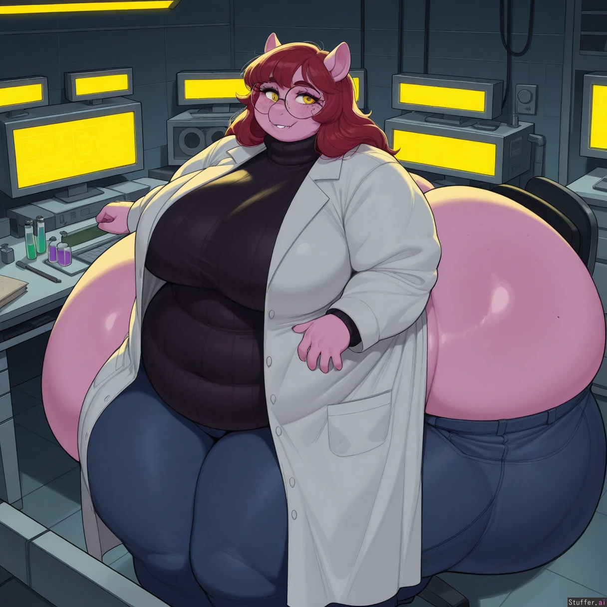 (highly detailed, best quality), (perfect anatomy, perfect fat proportions), (perfect lighting, warm lighting, vibrant colors, shadow, perfect shading), (beautiful face, beautiful eyes), (Krekkov(artist), KAMII MOMORU(artist)), (one immobile fat girl, solo), (laboratory, test tubes, lab equipment, lab desk), Biting lip, wince (Plump beautiful pony girl,cheerilee, anthro pony,adult, mature), (eyes, large eyes, eyelashes, flared lashes, looking at viewer), (, shiny light purple fur, ((freckles, mole under eye))), (Pony girl,anthro pony, pony snout, pony ears adult, mature, ), (hyper-long red hair, side swept straight hair), (yellow eyes, large eyes, eyelashes, flared lashes,), (light purple fur, fangs, shiny skin, ((freckles, freckles on ass, mole on asscheeks,mole under eye))),(((hyper-gut morbidly obese, hyper-butt))), (chubby plump face) ((lab coat, black turtleneck sweater, dark blue jeans, glasses)), ((((())))), (()), (swollen fat, curvy body), (round face), , (fat waist), (wide hips), (small butt), Sitting on chair to fat to move
