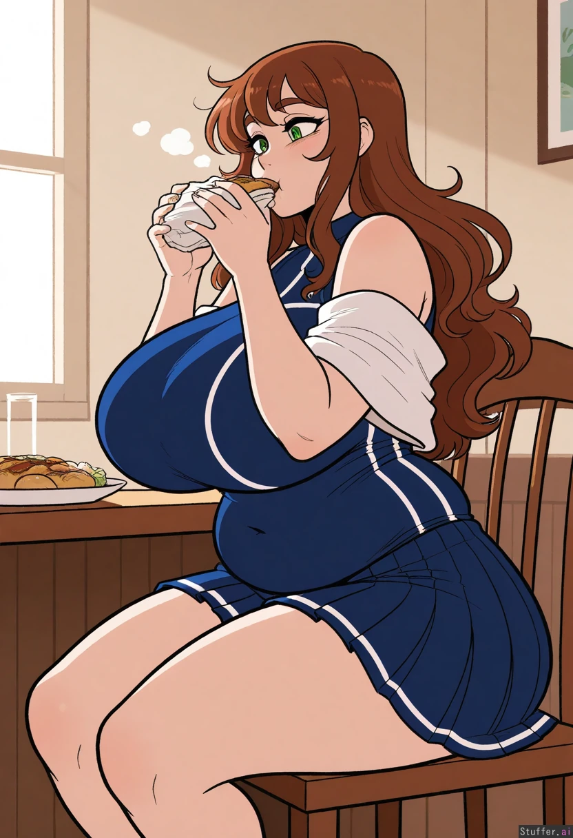 Anime, ((flat colors)), solo, perfect anatomy, anime-like, beautiful shading, beautiful lighting, high quality, (masterpiece), HDR, Dreamcore, scruffyturtles(artist), (Blue academy outfit, blue pleated skirt, white shawl, covered navel, short), Long wavy brown hair, brown bangs, green eyes, pale skin, short Dining room, buffet, sitting, cushioned chair, glutton, eating, focused, horny, ((Side view)), (((Normal weight))), (Chubby face, chubby plump arms), (Huge breasts, plump breasts, wide spread breasts), huge hips, wide hips, hips_wider_than_shoulders, huge butt, bubble_butt, huge thighs, thicc thighs
