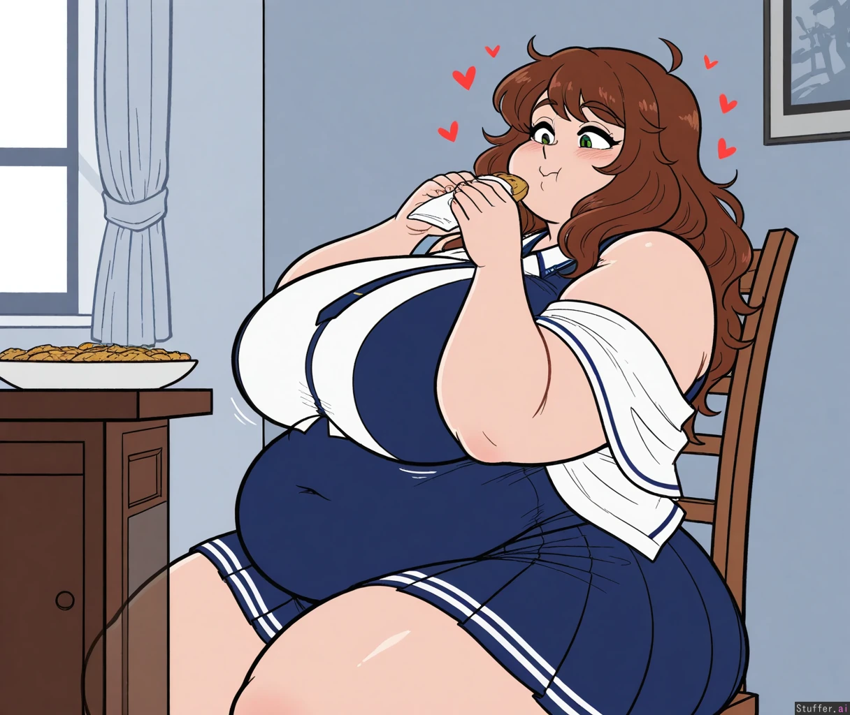 Anime, ((flat colors)), solo, perfect anatomy, anime-like, beautiful shading, beautiful lighting, high quality, (masterpiece), HDR, Dreamcore, scruffyturtles(artist), (Blue academy outfit, blue pleated skirt, white shawl, covered navel, short), Long wavy brown hair, brown bangs, green eyes, pale skin, short Dining room, buffet, sitting, cushioned chair, glutton, eating, focused, horny, hearts, ((Side view)), (((obese))), ((Fat round face, double chin, fat plump arms)), (Huge breasts, plump breasts, wide spread breasts), huge hips, wide hips, hips_wider_than_shoulders, huge butt, bubble_butt, huge thighs, thicc thighs, huge potbelly
