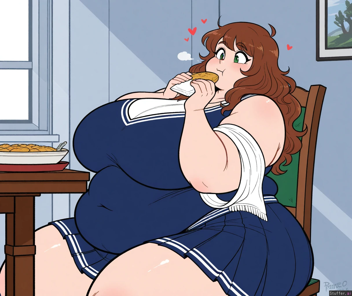 Anime, ((flat colors)), solo, perfect anatomy, anime-like, beautiful shading, beautiful lighting, high quality, (masterpiece), HDR, Dreamcore, scruffyturtles(artist), (Blue academy outfit, blue pleated skirt, white shawl, covered navel, short), Long wavy brown hair, brown bangs, green eyes, pale skin, short Dining room, buffet, sitting, cushioned chair, glutton, eating, focused, horny, hearts, ((Side view)), (((Morbidly obese))), ((Fat round face, double chin, fat plump arms)), (Huge breasts, plump breasts, wide spread breasts), huge hips, wide hips, hips_wider_than_shoulders, huge butt, bubble_butt, huge thighs, thicc thighs, huge potbelly