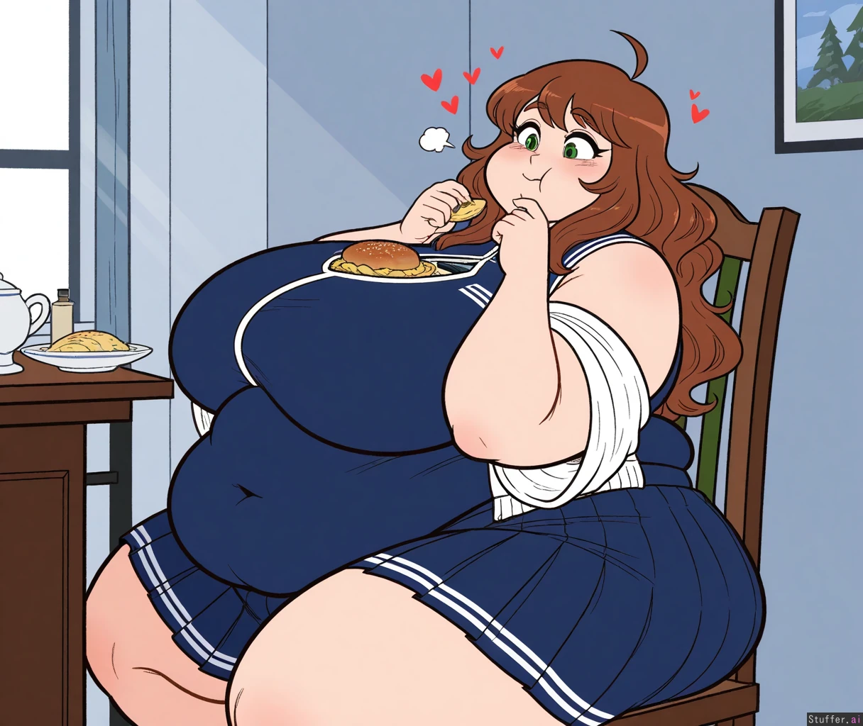 Anime, ((flat colors)), solo, perfect anatomy, anime-like, beautiful shading, beautiful lighting, high quality, (masterpiece), HDR, Dreamcore, scruffyturtles(artist), (Blue academy outfit, blue pleated skirt, white shawl, covered navel, short), Long wavy brown hair, brown bangs, green eyes, pale skin, short Dining room, buffet, sitting, cushioned chair, glutton, eating, focused, horny, hearts, ((Side view)), (((Morbidly obese, immobile))), ((Fat round face, double chin, fat plump arms)), (Huge breasts, plump breasts, wide spread breasts), huge hips, wide hips, hips_wider_than_shoulders, huge butt, bubble_butt, huge thighs, thicc thighs, huge potbelly