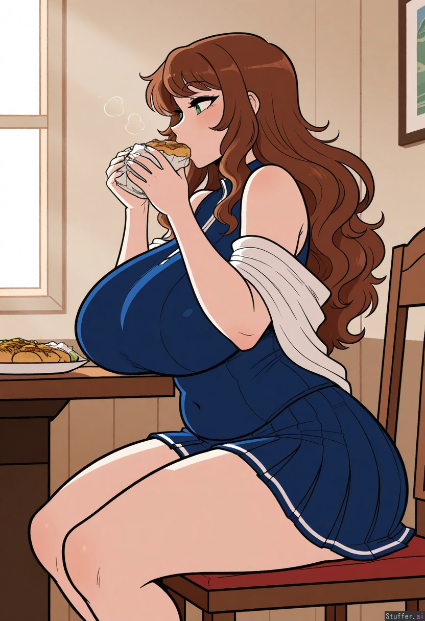 Anime, ((flat colors)), solo, perfect anatomy, anime-like, beautiful shading, beautiful lighting, high quality, (masterpiece), HDR, Dreamcore, scruffyturtles(artist), (Blue academy outfit, blue pleated skirt, white shawl, covered navel, short), Long wavy brown hair, brown bangs, green eyes, pale skin, short Dining room, buffet, sitting, cushioned chair, glutton, eating, focused, horny, ((Side view)), Skinny, (Huge breasts, plump breasts, wide spread breasts), huge hips, wide hips, hips_wider_than_shoulders, huge butt, bubble_butt, huge thighs, thicc thighs