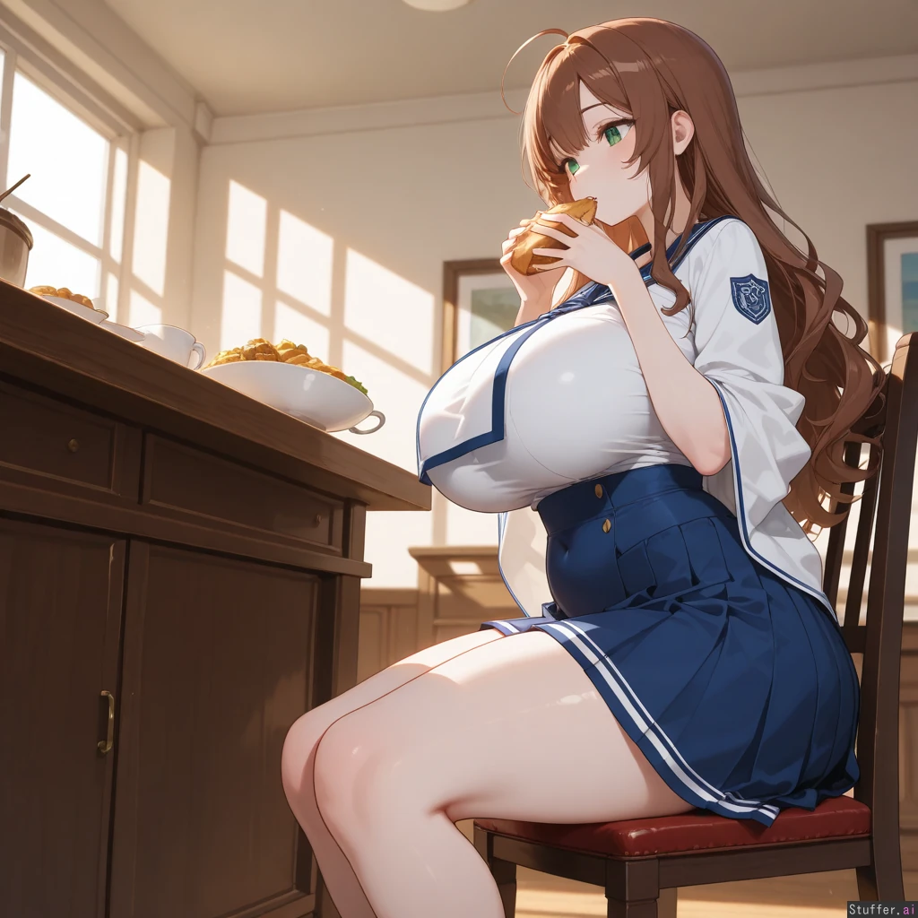 Anime, solo, perfect anatomy, anime-like, beautiful shading, beautiful lighting, high quality, (masterpiece), HDR, dreamcore, (Blue academy outfit, blue pleated skirt, white shawl, covered navel, short), Long wavy brown hair, brown bangs, green eyes, pale skin, short Dining room, buffet, sitting, cushioned chair, glutton, eating, focused, horny, ((Side view)), (((Normal weight))), (Huge breasts), huge hips, hips_wider_than_shoulders, huge butt, huge thighs