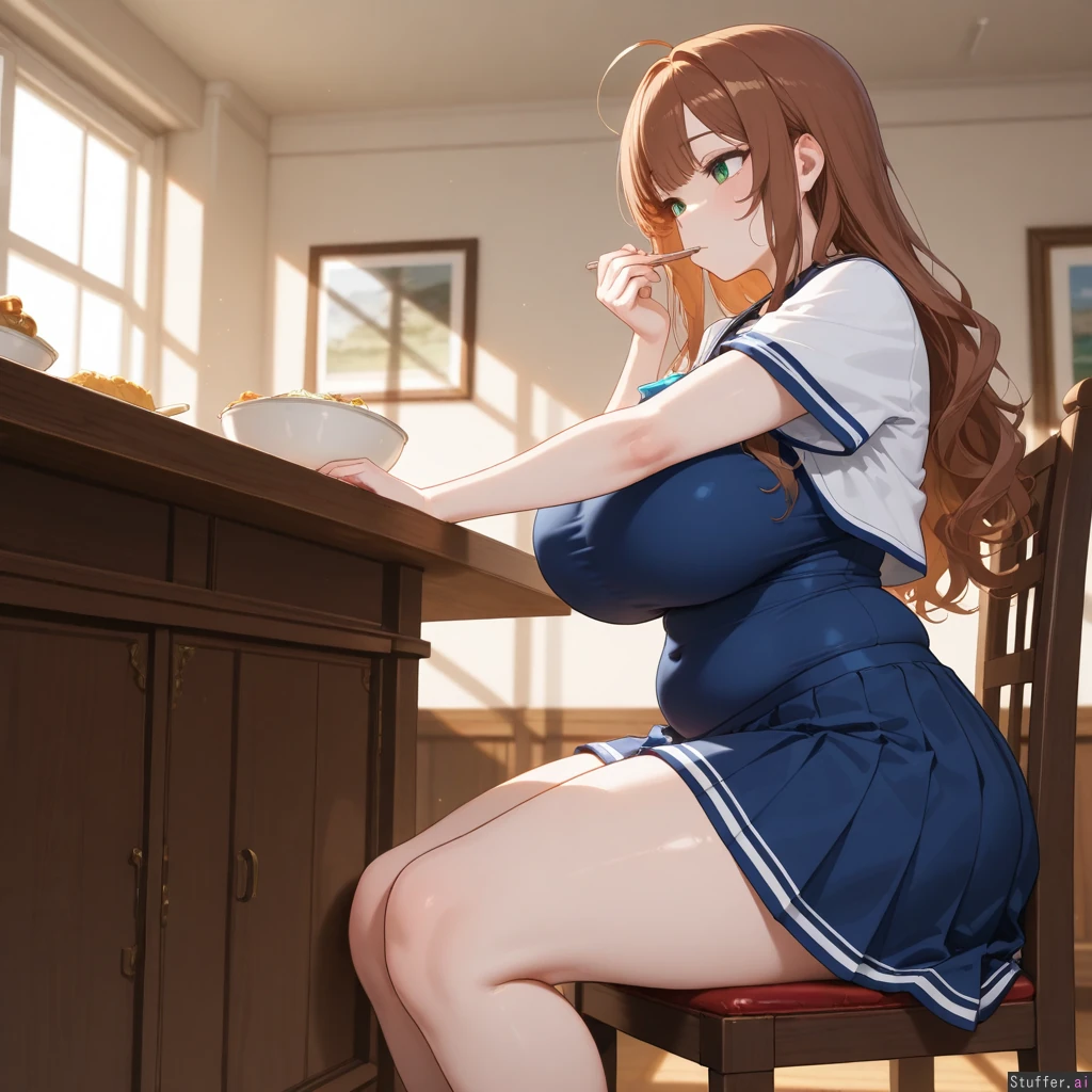 Anime, solo, perfect anatomy, anime-like, beautiful shading, beautiful lighting, high quality, (masterpiece), HDR, dreamcore, (Blue academy outfit, blue pleated skirt, white shawl, covered navel, short), Long wavy brown hair, brown bangs, green eyes, pale skin, short Dining room, buffet, sitting, cushioned chair, glutton, eating, focused, horny, ((Side view)), (((Normal weight))), Chubby face, chubby plump arms, (Huge breasts), huge hips, hips_wider_than_shoulders, huge butt, huge thighs
