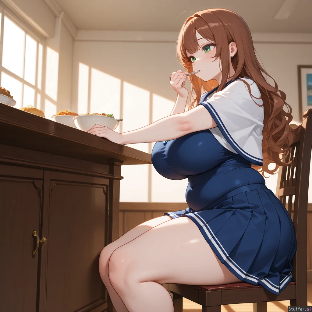 Anime, solo, perfect anatomy, anime-like, beautiful shading, beautiful lighting, high quality, (masterpiece), HDR, dreamcore, (Blue academy outfit, blue pleated skirt, white shawl, covered navel, short), Long wavy brown hair, brown bangs, green eyes, pale skin, short Dining room, buffet, sitting, cushioned chair, glutton, eating, focused, horny, ((Side view)), (((Normal weight))), (Chubby round face, chubby plump arms), (Huge breasts), huge hips, hips_wider_than_shoulders, huge butt, huge thighs