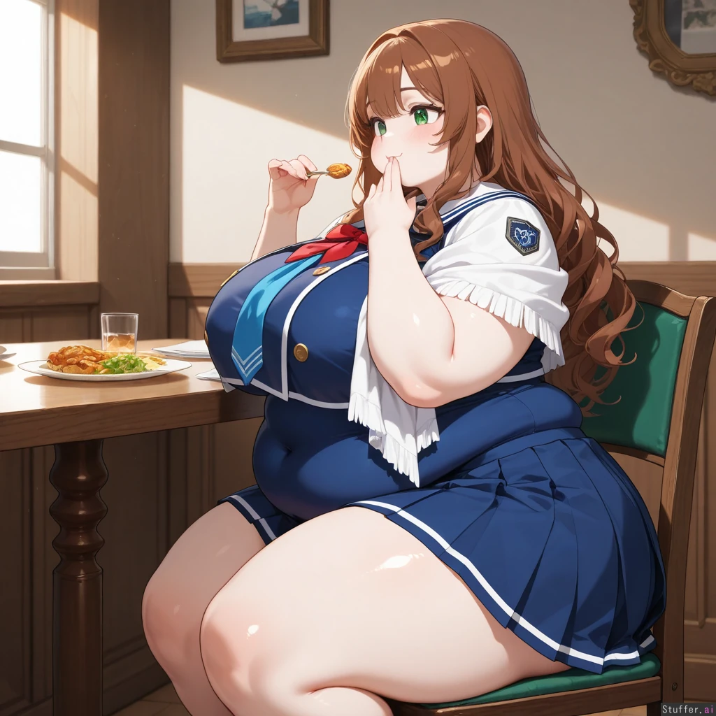 Anime, solo, perfect anatomy, anime-like, beautiful shading, beautiful lighting, high quality, (masterpiece), HDR, dreamcore, (Blue academy outfit, blue pleated skirt, white shawl, covered navel, short), Long wavy brown hair, brown bangs, green eyes, pale skin, short Dining room, buffet, sitting, cushioned chair, glutton, eating, focused, horny, ((Side view)), (((Obese))), ((Chubby round face, chubby plump arms)), (Huge breasts), huge hips, hips_wider_than_shoulders, huge butt, huge thighs