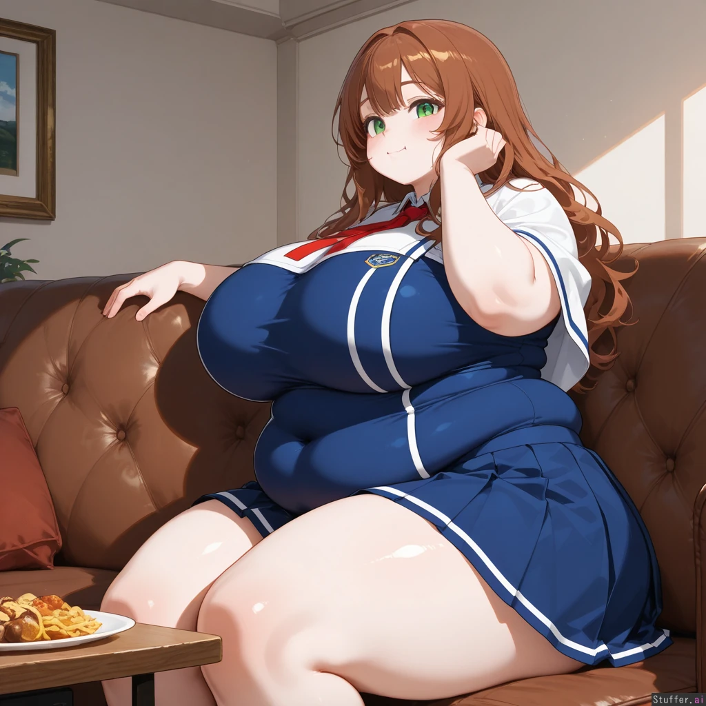 Anime, solo, perfect anatomy, anime-like, beautiful shading, beautiful lighting, high quality, (masterpiece), HDR, dreamcore, (Blue academy outfit, blue pleated skirt, white shawl, covered navel, short), Long wavy brown hair, brown bangs, green eyes, pale skin, short Dining room, buffet, sitting, cushioned couch, glutton, eating, focused, horny, ((Side view)), (((Obese))), ((Chubby round face, chubby plump arms)), (Huge breasts), huge hips, hips_wider_than_shoulders, huge butt, huge thighs