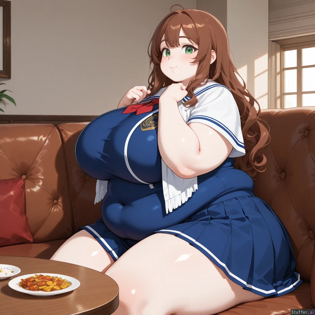 Anime, solo, perfect anatomy, anime-like, beautiful shading, beautiful lighting, high quality, (masterpiece), HDR, dreamcore, (Blue academy outfit, blue pleated skirt, white shawl, covered navel, short), Long wavy brown hair, brown bangs, green eyes, pale skin, short Dining room, buffet, sitting, cushioned couch, glutton, eating, focused, horny, ((Side view)), (((Obese))), ((Fat round face, double chin, fat plump arms)), (Huge breasts), huge hips, hips_wider_than_shoulders, huge butt, huge thighs