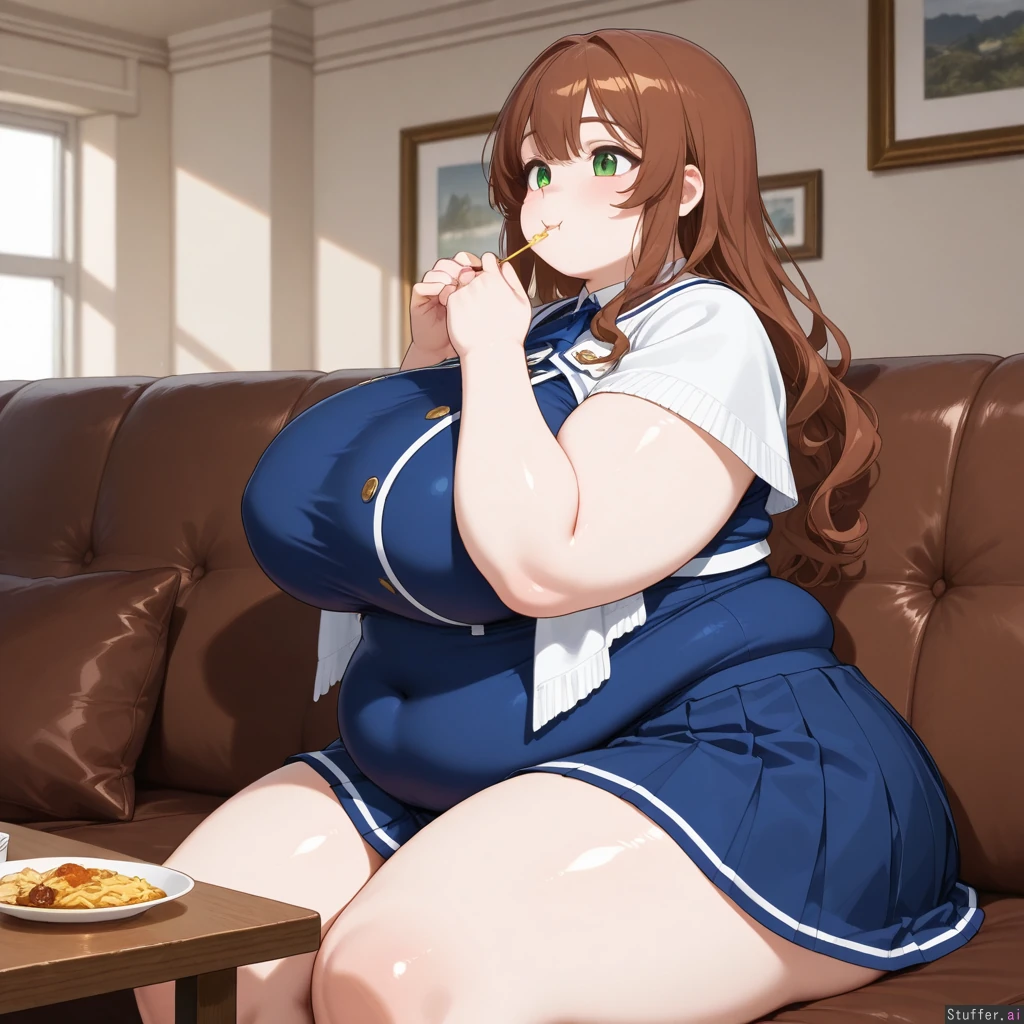 Anime, solo, perfect anatomy, anime-like, beautiful shading, beautiful lighting, high quality, (masterpiece), HDR, dreamcore, (Blue academy outfit, blue pleated skirt, white shawl, covered navel, short), Long wavy brown hair, brown bangs, green eyes, pale skin, short Dining room, buffet, sitting, cushioned couch, glutton, (eating, focused), horny, ((Side view)), (((Obese))), ((Fat round face, double chin, fat plump arms)), (Huge breasts), huge hips, hips_wider_than_shoulders, huge butt, huge thighs