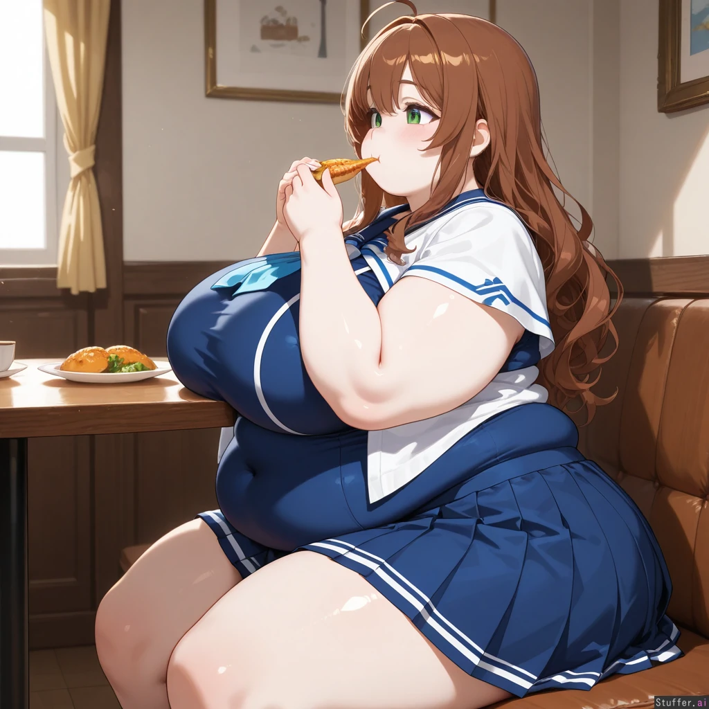 Anime, solo, perfect anatomy, anime-like, beautiful shading, beautiful lighting, high quality, (masterpiece), HDR, dreamcore, (Blue academy outfit, blue pleated skirt, white shawl, covered navel, short), Long wavy brown hair, brown bangs, green eyes, pale skin, short Dining room, buffet, sitting, cushioned bench, glutton, (eating, focused), horny, ((Side view)), (((Obese))), ((Fat round face, double chin, fat plump arms)), (Huge breasts), huge hips, hips_wider_than_shoulders, huge butt, huge thighs