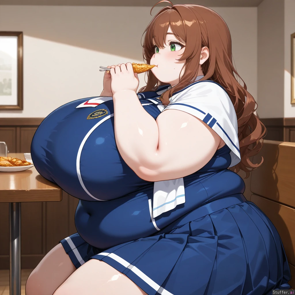 Anime, solo, perfect anatomy, anime-like, beautiful shading, beautiful lighting, high quality, (masterpiece), HDR, dreamcore, (Blue academy outfit, blue pleated skirt, white shawl, covered navel, short), Long wavy brown hair, brown bangs, green eyes, pale skin, short Dining room, buffet, sitting, cushioned bench, glutton, (eating, focused), horny, ((Side view)), (((Obese))), ((Fat round face, double chin, fat plump arms)), (Gigantic breasts), gigantic hips, hips_wider_than_shoulders, gigantic butt, gigantic thighs