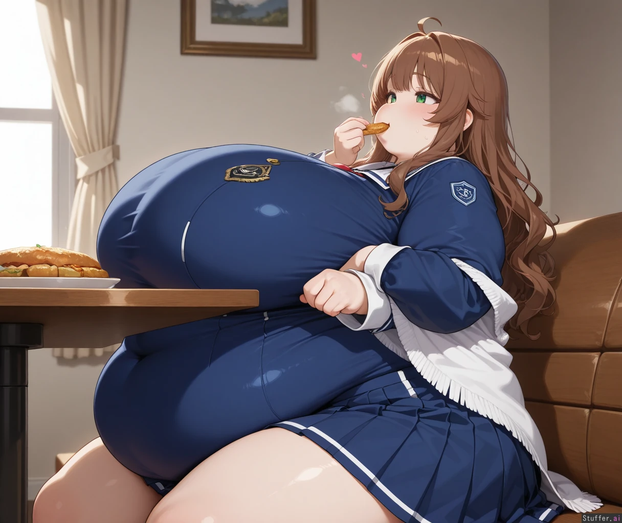 Anime, solo, perfect anatomy, anime-like, beautiful shading, beautiful lighting, high quality, (masterpiece), HDR, dreamcore, (Blue academy outfit, blue pleated skirt, white shawl, covered navel, short), Long wavy brown hair, brown bangs, green eyes, pale skin, short Dining room, buffet, sitting, cushioned bench, glutton, (eating, focused), horny, heavy breathing, hearts, ((Side view)), (((Morbidly Obese, immobile))), ((Fat round face, double chin, fat plump arms)), (Gigantic breasts), gigantic hips, hips_wider_than_shoulders, gigantic butt, gigantic thighs