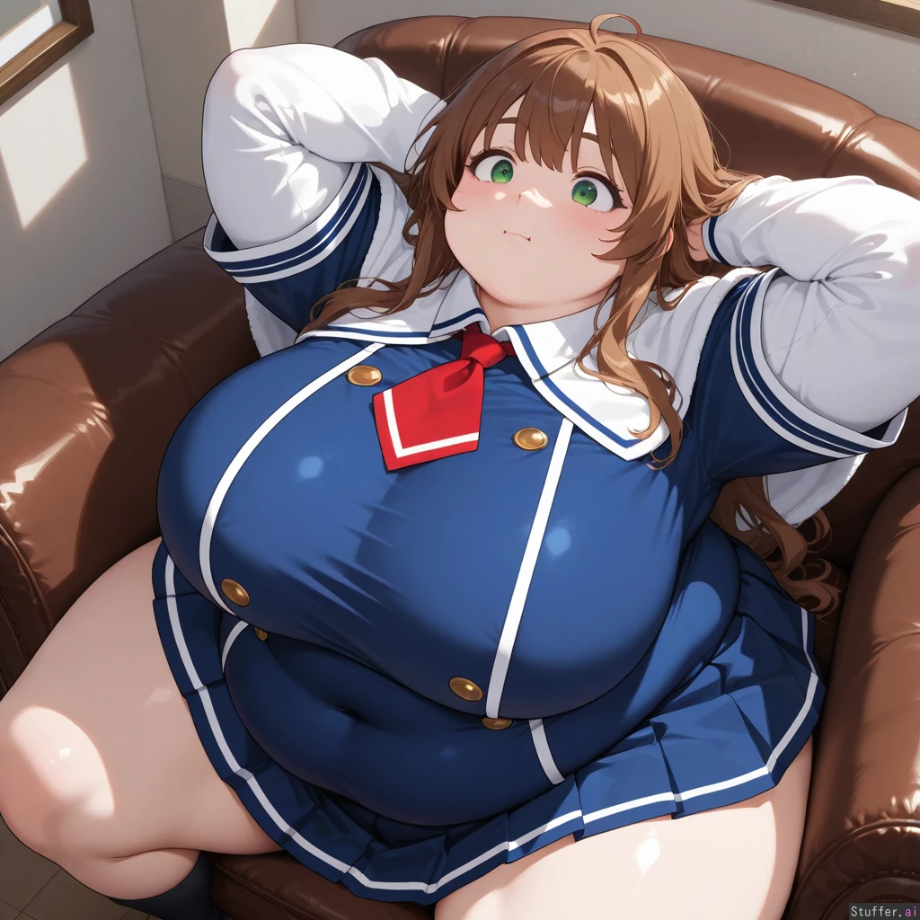 Anime, solo, perfect anatomy, anime-like, beautiful shading, beautiful lighting, high quality, (masterpiece), HDR, dreamcore, (Blue academy outfit, blue pleated skirt, white shawl, covered navel, short), Long wavy brown hair, brown bangs, green eyes, pale skin, short Getting up, cushioned armchair, shocked, surprised, ((stuck)), High angle, from above, (((Obese))), ((Fat round face, double chin, fat plump arms)), (Huge breasts), huge hips, hips_wider_than_shoulders, huge butt, huge thighs