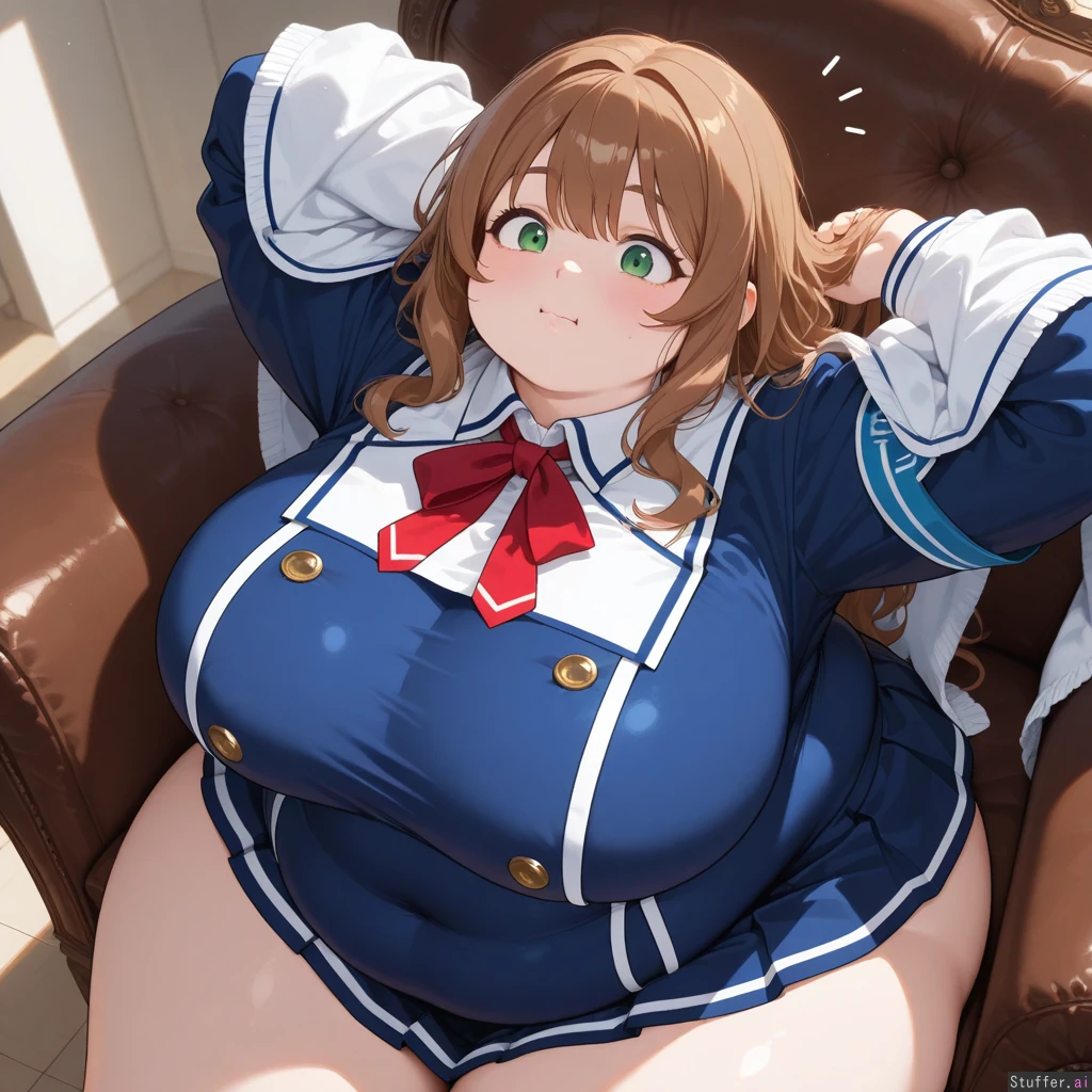 Anime, solo, perfect anatomy, anime-like, beautiful shading, beautiful lighting, high quality, (masterpiece), HDR, dreamcore, (Blue academy outfit, blue pleated skirt, white shawl, covered navel, short), Long wavy brown hair, brown bangs, green eyes, pale skin, short Leaning forward, cushioned armchair, shocked, surprised, ((stuck)), High angle, from above, (((Obese))), ((Fat round face, double chin, fat plump arms)), (Huge breasts), huge hips, hips_wider_than_shoulders, huge butt, huge thighs