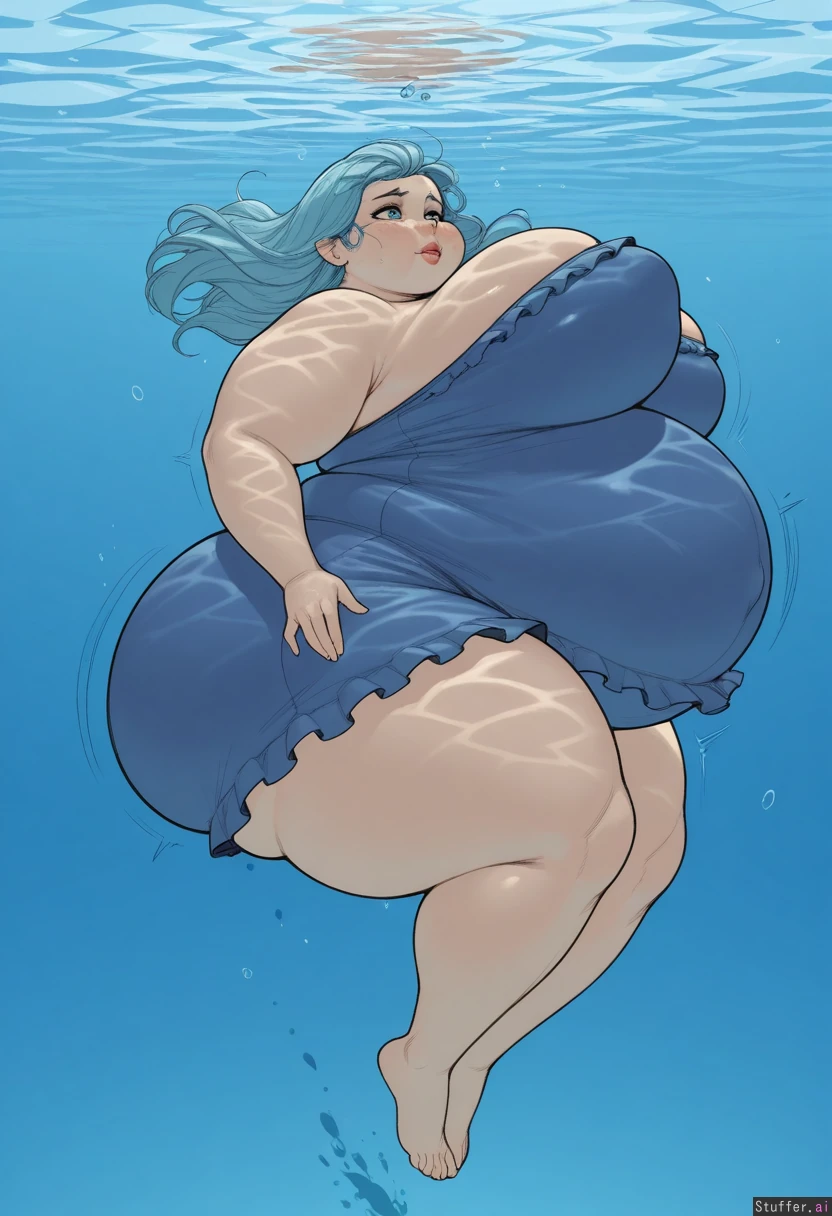 Krekkov artist, KAMII MOMORU(artist) Flat color, high quality, Samus aran, fertile, feminine, female, woman 20 years, (red lips, big lips:1.4, smooth lips), very long soft hair, wavy bangs, chubby, pregnant, round cheeks, pendant, freckles, eyes_half_closed, half_closed_eyes blue eyes, view from side, half underwater view, ((obese, overweight, bbw, ssbbw), (wide hips, massive fat legs,hyper massive fat thighs, hyper gigantic fat ass:1.3), small frilly dress, (thin arms), (thin legs)),middle of the lake, fumbling, insecure, following the viewer, ((really hot pregnant wife who cannot swim)), (deep underwater, sinking, bouncing), (flailing, kicking), (hair floating up:1.5), (boobs floating up:1.7), ((heavy belly sinking her, feet midair, she cannot float, sinking to the bottom, fat pregnant lady cannot swim)), (puffed cheeks:1.5), (mouth closed, puckered lips), deep rough water, far from shore, she feels sad, she is too heavy and pregnant to swim, she is really scared of sinking, she is really embarrassed, crying, (helpless, scared of deep water, she begs you to save her, pregnancy hormones), (heavy drowning), 1girl, solo, small hands, soft arms
