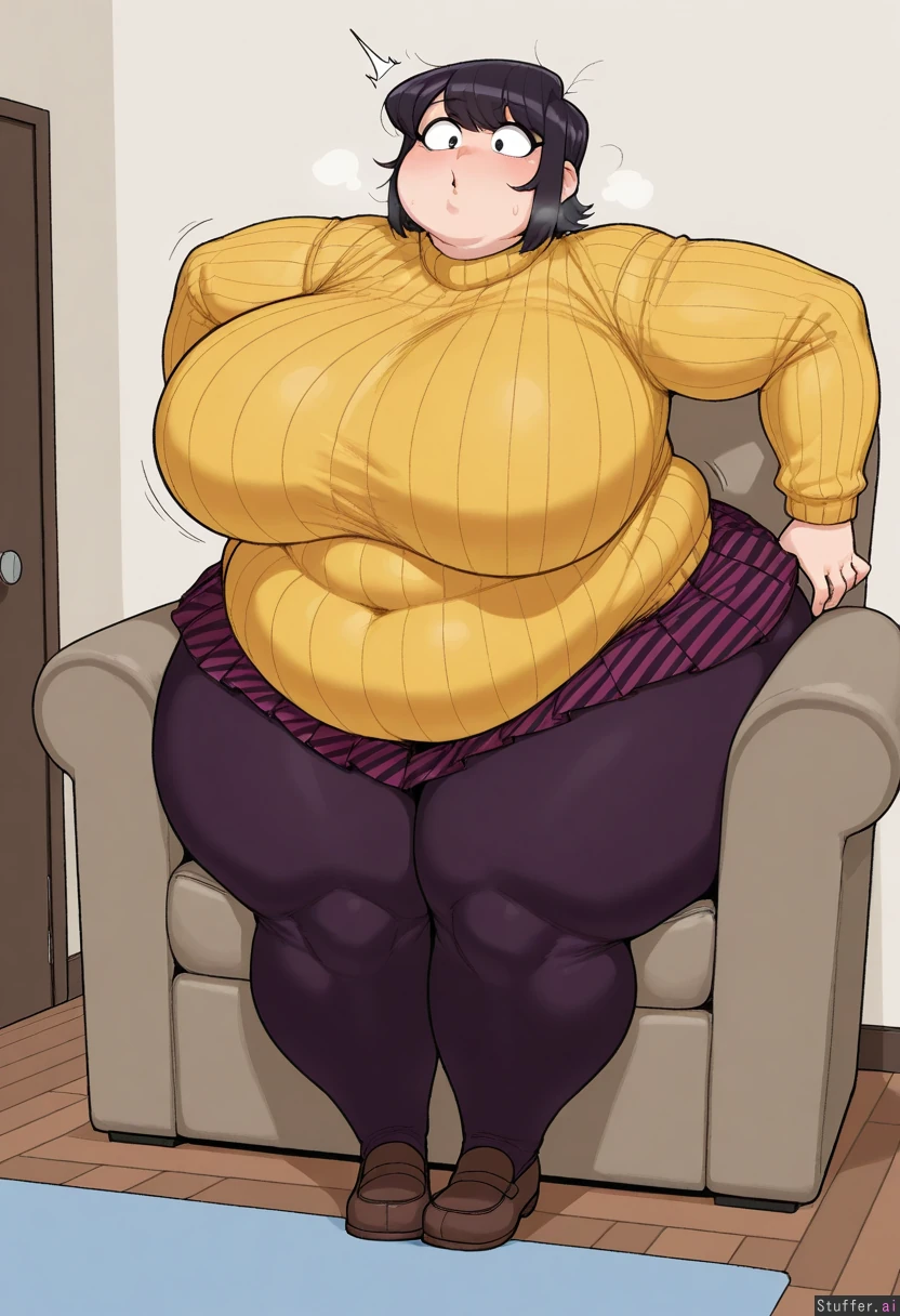 Best quality, top rated, high res, masterpiece, perfect anatomy, score_7, krekkov, Solo, 1girl, tall, Living room, (leaning forward), huge cushioned armchair, (stuckage, heavy breathing, exhausted, wiggling, shocked, surprised, getting up), ((Shoko komi)), (Long blue pleated skirt, covered knees, covered ankles, covered navel, long sleeve yellow neck ribbed sweater , brown loafers), (((Morbidly Obese, immobile, extreme weight gain))), ((Fat round face, double chin, fat plump arms)), (Gigantic breasts), gigantic hips, gigantic ass