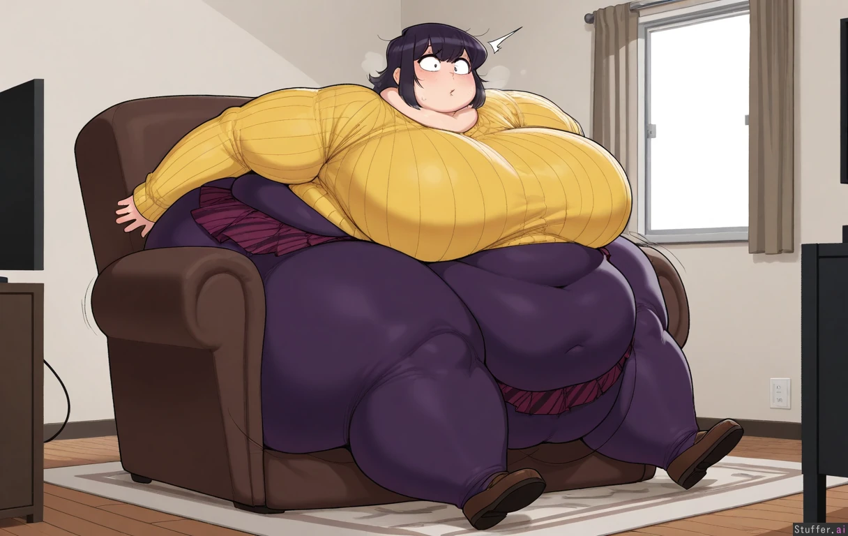 Best quality, top rated, high res, masterpiece, perfect anatomy, score_7, krekkov, Solo, 1girl, tall, Living room, window, (leaning forward), huge cushioned armchair, (stuckage, heavy breathing, exhausted, wiggling, shocked, surprised, getting up), ((Shoko komi)), (Long blue pleated skirt, covered knees, covered ankles, covered navel, long sleeve yellow neck ribbed sweater , brown loafers), (((Morbidly Obese, immobile, extreme weight gain))), ((Fat round face, double chin, fat plump arms)), (Gigantic breasts), gigantic hips, gigantic ass