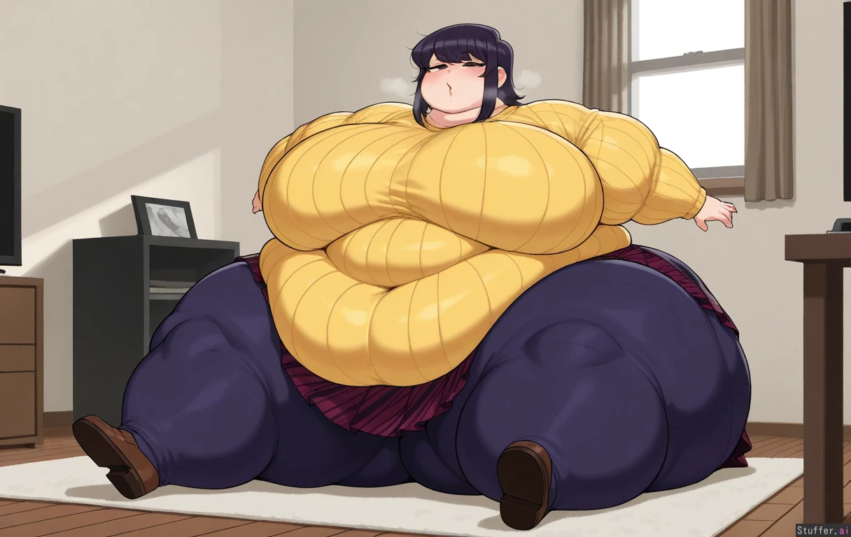 Best quality, top rated, high res, masterpiece, perfect anatomy, score_7, krekkov, Solo, 1girl, tall, Living room, window, (sitting on floor), (stuckage, heavy breathing, exhausted, wiggling, embarassed, weight conscious), ((Shoko komi)), (Long blue pleated skirt, covered knees, covered ankles, covered navel, long sleeve yellow neck ribbed sweater , brown loafers), (((Morbidly Obese, immobile, extreme weight gain))), ((Fat round face, double chin, fat plump arms)), (Gigantic breasts), gigantic hips, gigantic ass