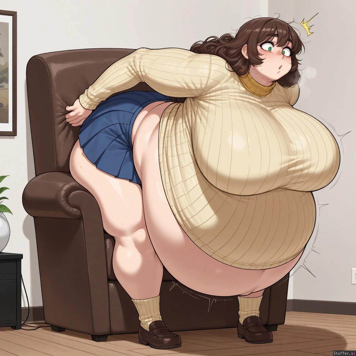 Best quality, top rated, high res, masterpiece, perfect anatomy, score_7, krekkov, Solo, 1girl, tall, Living room, (leaning forward), huge cushioned armchair, (stuckage, heavy breathing, exhausted, wiggling, shocked, surprised), Long curly brown hair, brown bangs, green eyes, (Long blue pleated skirt, covered knees, covered ankles, covered navel, long sleeve yellow neck ribbed sweater , brown loafers), (((Morbidly Obese, inflation, inflation_fetish, immobile, extreme weight gain))), ((Fat round face, double chin, fat plump arms)), (Gigantic breasts), gigantic hips, gigantic ass