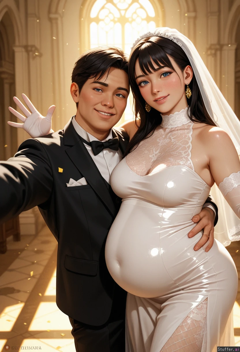 (best quality), (high rating), high res, detailed, ultra quality, ((high quality)), masterpiece, (ultra high resolution), resolution, 8k, uhd, highly detailed illustration, high rating, high contrast, fullHD, (((detailed face, detailed eyes, photorealistic retro))), 1girl, American Girl, 30yo, long straight black hair, blue eyes, blue eyeshadow, eyelashes, skinny body, shiny skin, dimples, body freckles, (hyperdetailed skin), flared lashes, eyeliner, mascara, gold wedding ring, gold loop earrings, five fingers, mature, BREAK, wearing white turtleneck wedding dress, sleeveless, fully covered, white fishnet, white gloves, veil, OverallDetail),)), BREAK, 1Man, husband, Man wearing black tuxedo, blush, wedding, confetti, upper body, romantic, arm around waist, standing, smile, hetero, straight couple, newlyweds, looking at viewer, front view, head tilt, waving, BREAK, In Church, selfie, Real Sunlight with slight warmth, not neutral grey, Natural contrast (not flat,) Accurate white balance True-to-life colors skin tones rich and dimensional, No faded, dusty, pastel, or washed-out colors, perfect shadows, Cinematic, film grain, cinematic, volumetric light source, (((morbidly obese))),((fat Arms)), (((((fat legs))))), (((sagging belly))),wide hips, big ass, medium breasts (((Hyper massively pregnant with multiples:1.4)))