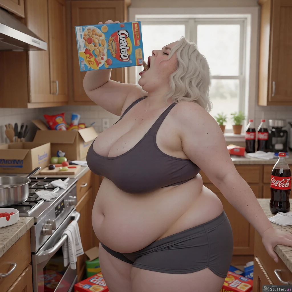 More detailed_face, make the kitchen messy, slob, highres, best_quality, food boxes on ground, lazy, 2 liter cokes in background