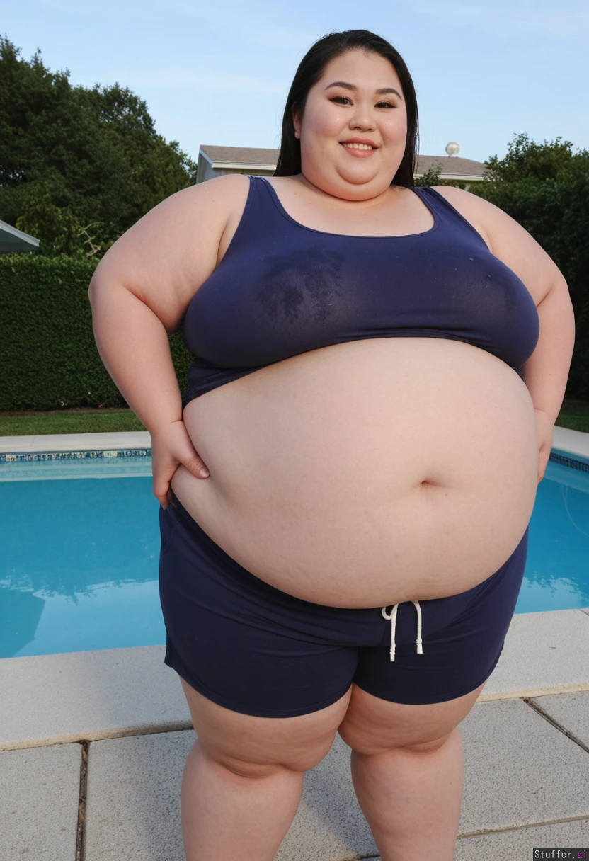 (((1girl, Asian ussbbw, ssbbw, thick thighs, extremely overweight, immobile, big loose wet top and shortpants, morbid weight gain))), correct anatomy, standing, smiling, looking up, side view, bbw, gigantic belly, bloated belly, poolside, dawn, fat arms