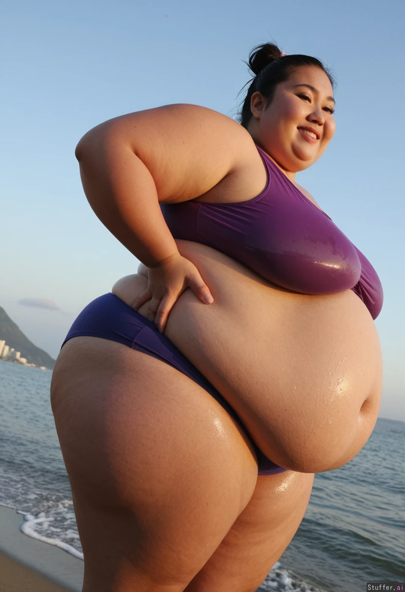 (((1girl, Asian ussbbw, ssbbw, thick thighs, extremely overweight, immobile, big loose wet top and shortpants, morbid weight gain))), correct anatomy, standing, smiling, looking up, side view, bbw, gigantic belly, bloated belly, beach, Brazil, Rio de Janeiro, dawn, fat arms