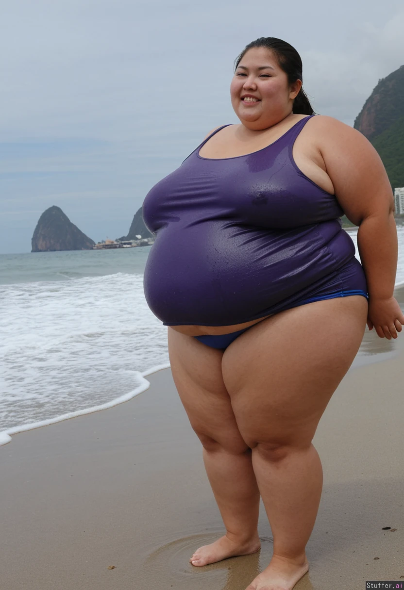 (((1girl, Asian ussbbw, ssbbw, thick thighs, extremely overweight, immobile, big loose wet top and shortpants, morbid weight gain))), correct anatomy, standing, smiling, looking up, side view, bbw, gigantic belly, bloated belly, beach, Brazil, Rio de Janeiro, dawn, fat arms
