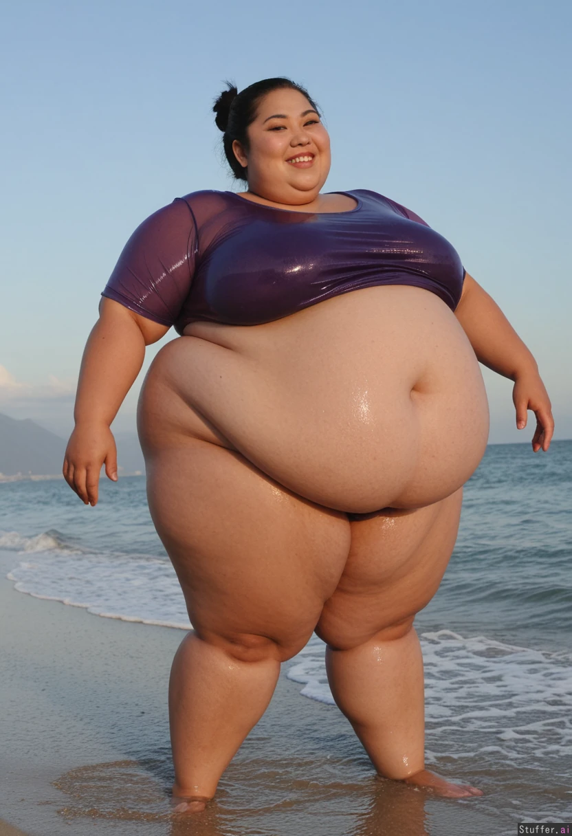 (((1girl, Asian ussbbw, ssbbw, thick thighs, extremely overweight, immobile, big loose wet top and shortpants, morbid weight gain))), correct anatomy, standing, smiling, looking up, side view, bbw, gigantic belly, bloated belly, beach, Brazil, Rio de Janeiro, dawn, fat arms, huge ass. bottomheavy, booty