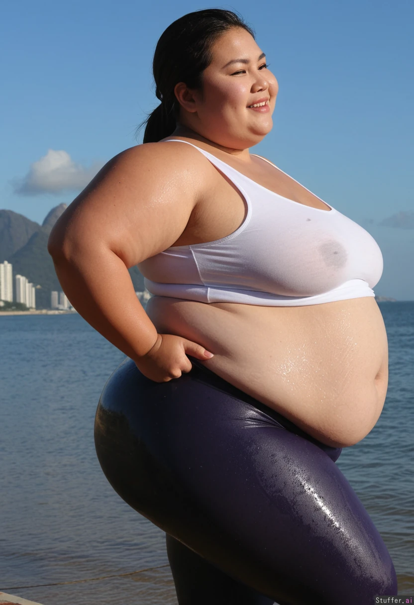 (((1girl, Asian ussbbw, ssbbw, thick thighs, extremely overweight, immobile, big loose wet top and leggings, morbid weight gain))), correct anatomy, standing, smiling, looking up, side view, bbw, gigantic belly, bloated belly, beach, Brazil, Rio de Janeiro, dawn, fat arms, huge ass. bottomheavy, booty, bubble_butt
