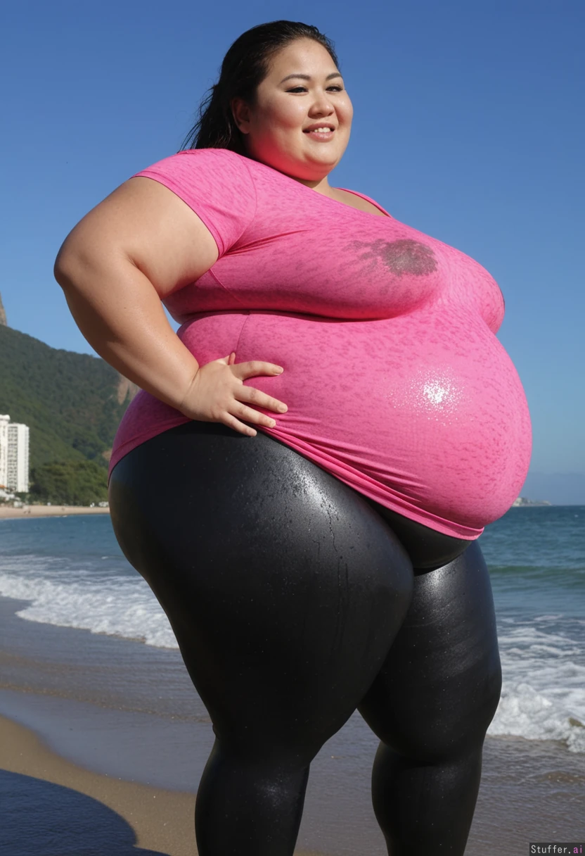 (((1girl, Asian ussbbw, ssbbw, thick thighs, extremely overweight, immobile, big loose wet top and leggings, morbid weight gain))), correct anatomy, standing, smiling, looking up, side view, bbw, gigantic belly, bloated belly, beach, Brazil, Rio de Janeiro, dawn, fat arms, huge ass. bottomheavy, booty, bubble_butt